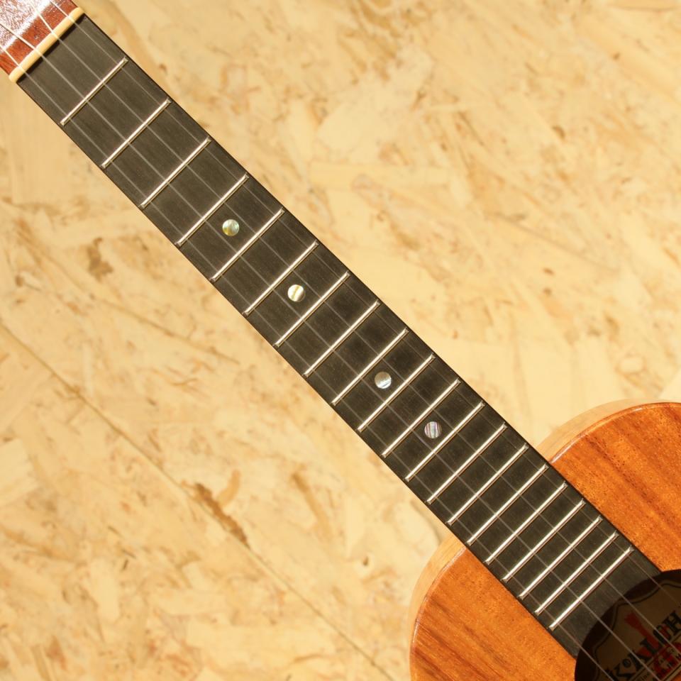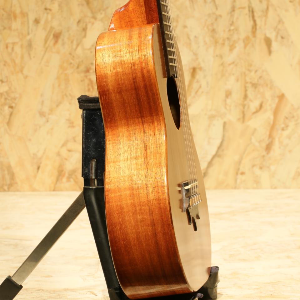 アルヴィン・オカミにより1995年に創設されたコアロハ・ウクレレ。現在は長男で社長のアランと、次男で副社長のポールを中心に、少数精鋭にて運営されております。今ではハワイを代表するウクレレメーカーの一つとなったコアロハ。モダンなルックスデザイン、優れた演奏性で、他のメーカーにはないハイファイでクリア、そしてなんと言っても大きな音量が特徴。本器はテナースタンダードモデル”KTM-00”、クラウンブリッジ仕様の1本。2005年製使用感極薄のUSED品。ハワイアンコアボディ、マホガニーネック、エボニー指板&ブリッジ、ドット指板インレイ、Groverギヤペグ仕様。杢目が良く映えるグロス塗装に身を包み、装飾の多すぎない仕様から木材の風合いを存分に楽しむことが出来るルックス。クラウン型のヘッド、おむすびをモチーフとしたサウンドホールなど個性溢れるデザイン、本器はブリッジ形状までクラウン型でさらなる個性を与えられています。コアロハらしい躍動感のある弾け方、クリアな響き。テナーサイズで音のハリもあり、ボリューム感も含め存在感の大きなサウンドを体感できます。瞬間的な爆発力から繊細な響きまで、強弱もつけやすく表現力の高い1本。ダイナミックなストラミングにも、繊細なソロプレイにも対応できるテナーサイズウクレレです。ボディバック1弦側下部の角、ボディバック4弦側くびれ角箇所、ボディトップ4弦側くびれ角箇所に光に透かすと分かる程度の極薄い当てキズ、サウンドホールとブリッジの間2弦と3弦中間に爪が当たったであろう当てキズやブリッジ3弦下部に尖ったもので擦ったような擦りキズが見られるのが惜しい点。それらの点を除けば極々薄いクロスでの拭きキズが僅か見られるほどでキレイなコンディションをキープされた個体。ネックや弦高などのプレイコンディションは整えられ、演奏しやすい状態をキープした抜群の1本です。珍しい仕様を与えられたコアロハのテナーサイズウクレレ。一度触ると虜のなる方も多いサウンドです。是非お手に取ってお試しください。