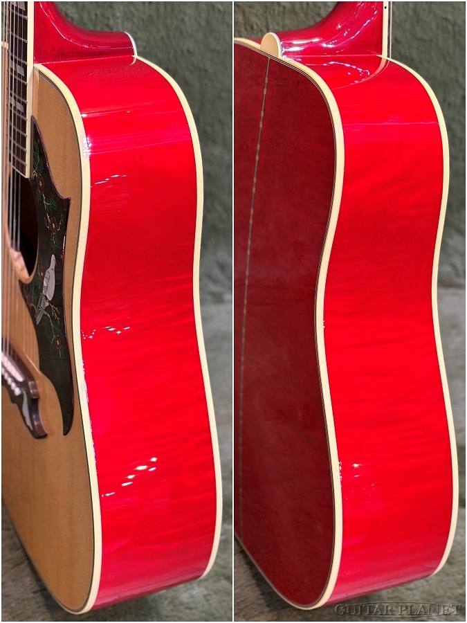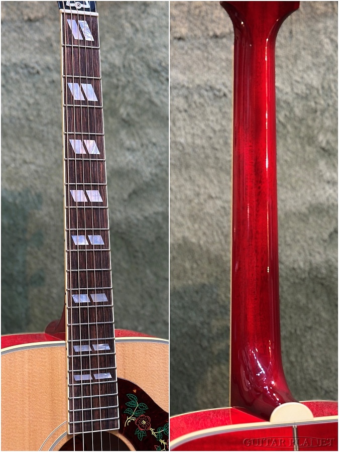 スクエアショルダー・ボディにロングスケールを採用した、伝統的なダヴ・シェイプのトップには『シトカ・スプルース』、主にアラスカ産を使用し、サイド&バックにはギブソンの高級機種に使用される『フレイム・メイプル』を採用。ネックにはにはホンジュラス・マホガニーの遺伝子を継承したボリビア、ペルー、ニカラグア、サウザンメキシコ、フィジー、インディアのいずれかで産出された『ジェニュイン・マホガニー』を採用。指板&ブリッジは『インディアン・ローズウッド』を使用。ヘッドに輝く『クラウン・インレイ』は上位モデルの証です。