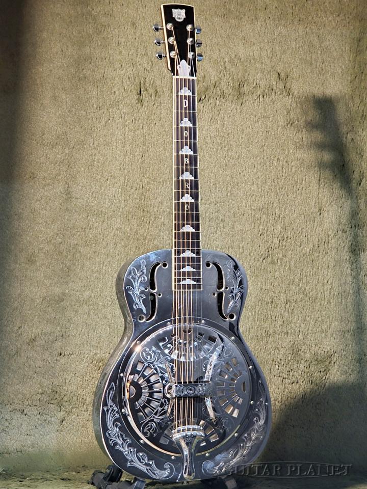 シールド(盾)モチーフの装飾が随所にあしらわれており、リゾネーターらしい“見せる楽器”としての魅力を存分に感じさせるルックスに仕上げられています。