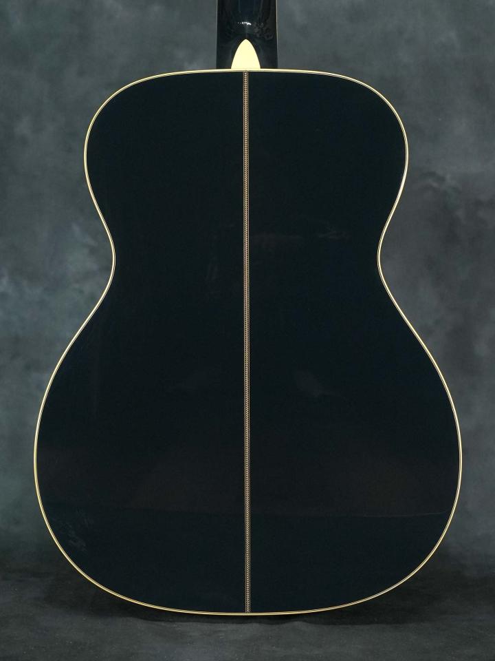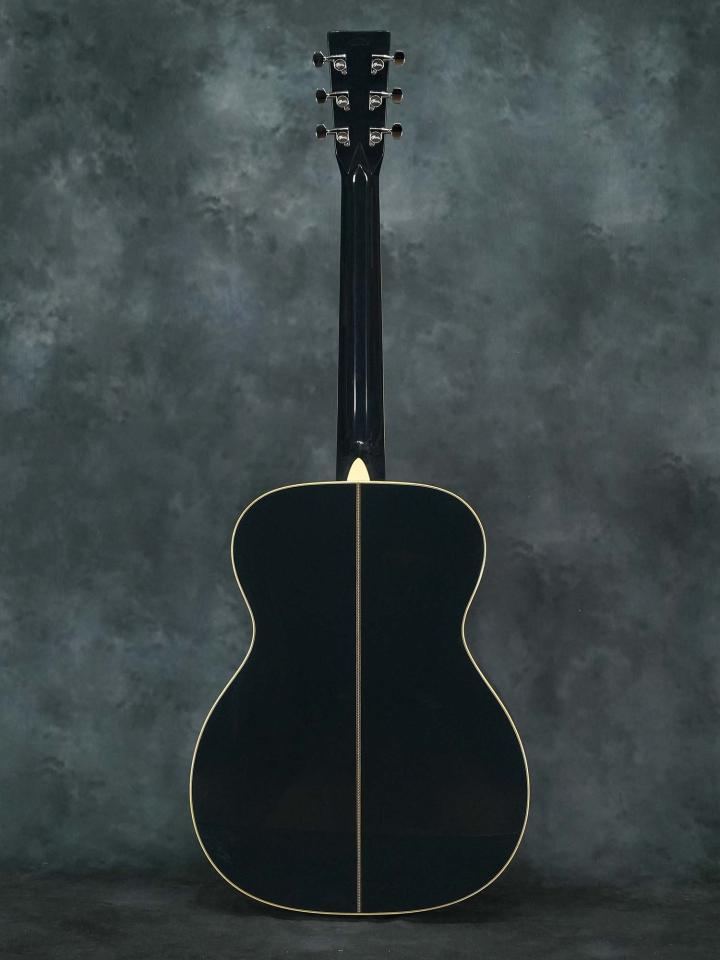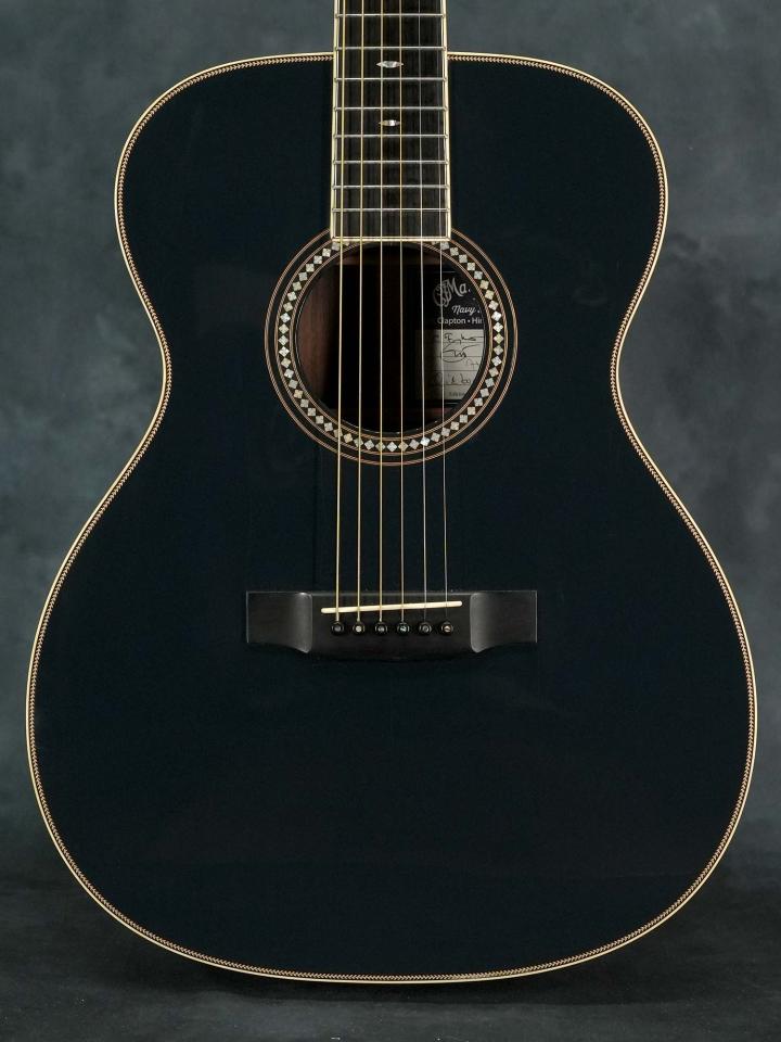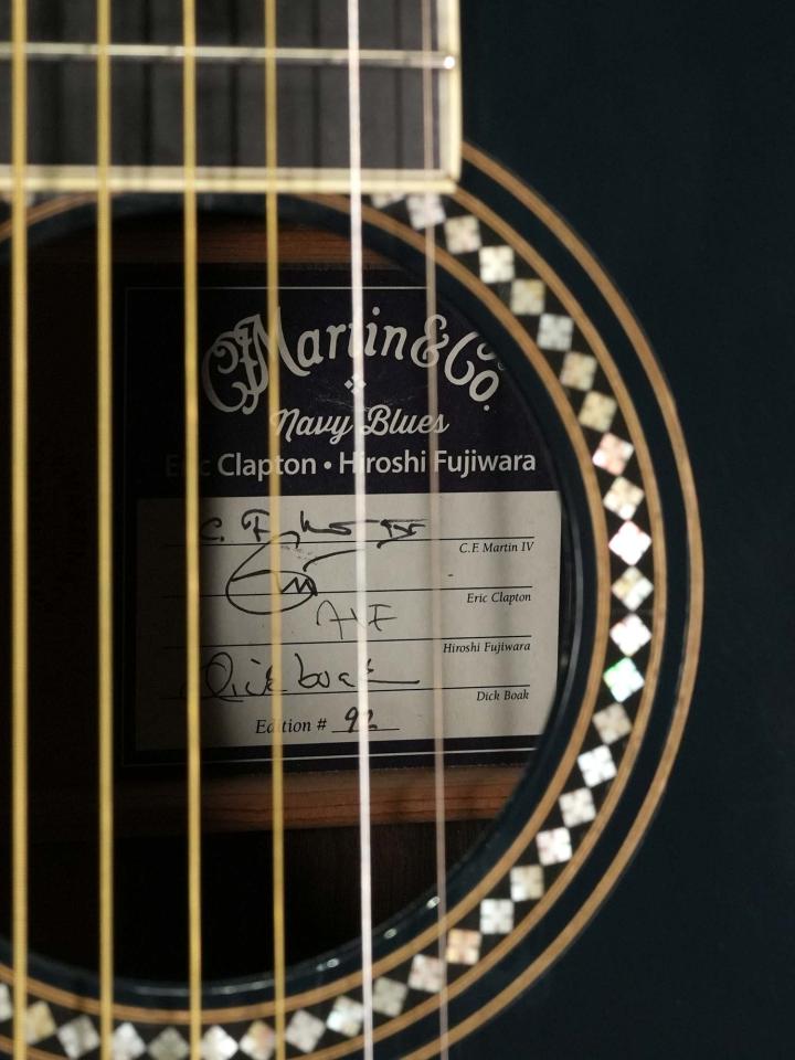 それまでの24.9インチスケールを採用した000モデルではなく本器は若干長い25.4インチスケールを採用したOMモデルで、濃い青色の「Navy Blues」カラーにマザーオブパールを使用したスクエアデザインのロゼッタのコントラストが美しく、ボディ内ラベルは通し番号に加えて「Eric Clapton・Hiroshi Fujiwara・C.F.Martin IV・Dick Boak」4氏の直筆サインが入っています。