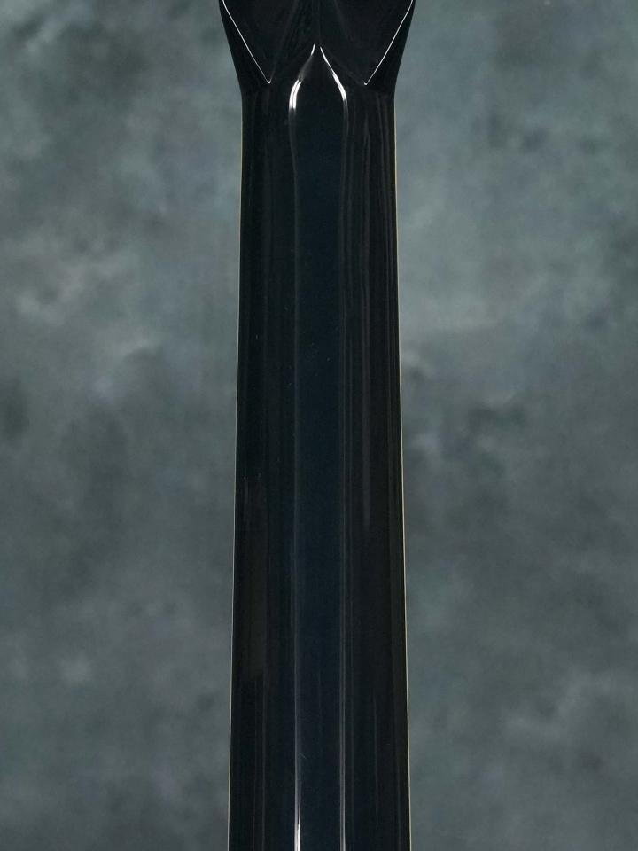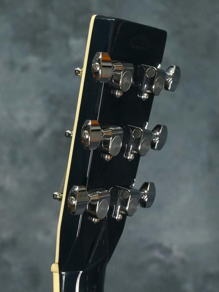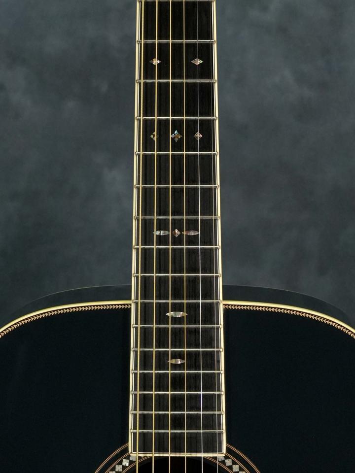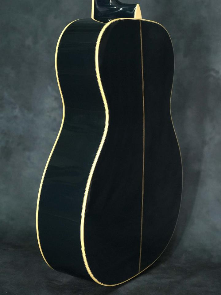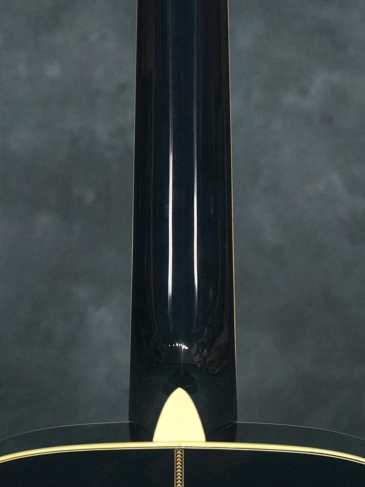 それまでの24.9インチスケールを採用した000モデルではなく本器は若干長い25.4インチスケールを採用したOMモデルで、濃い青色の「Navy Blues」カラーにマザーオブパールを使用したスクエアデザインのロゼッタのコントラストが美しく、ボディ内ラベルは通し番号に加えて「Eric Clapton・Hiroshi Fujiwara・C.F.Martin IV・Dick Boak」4氏の直筆サインが入っています。