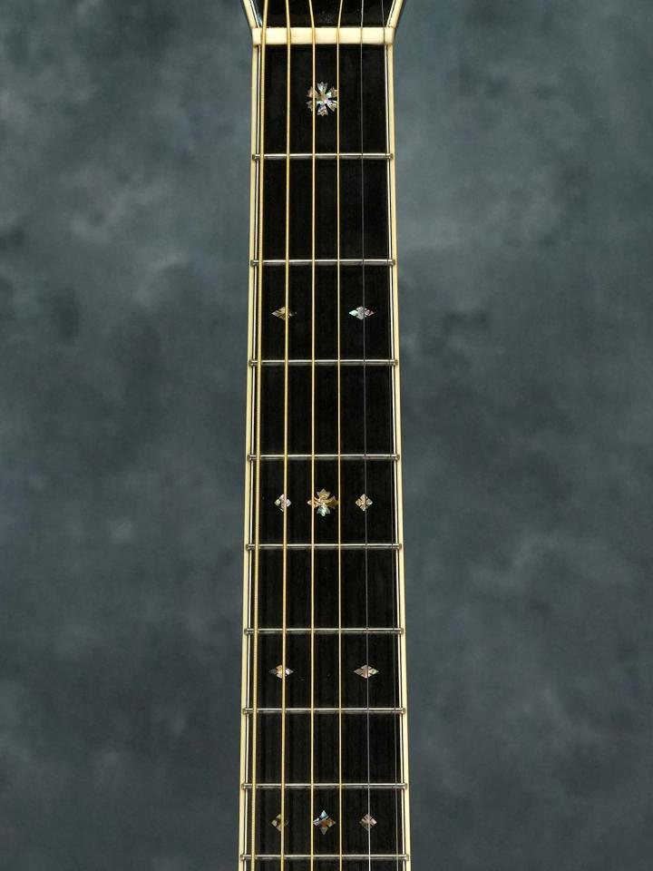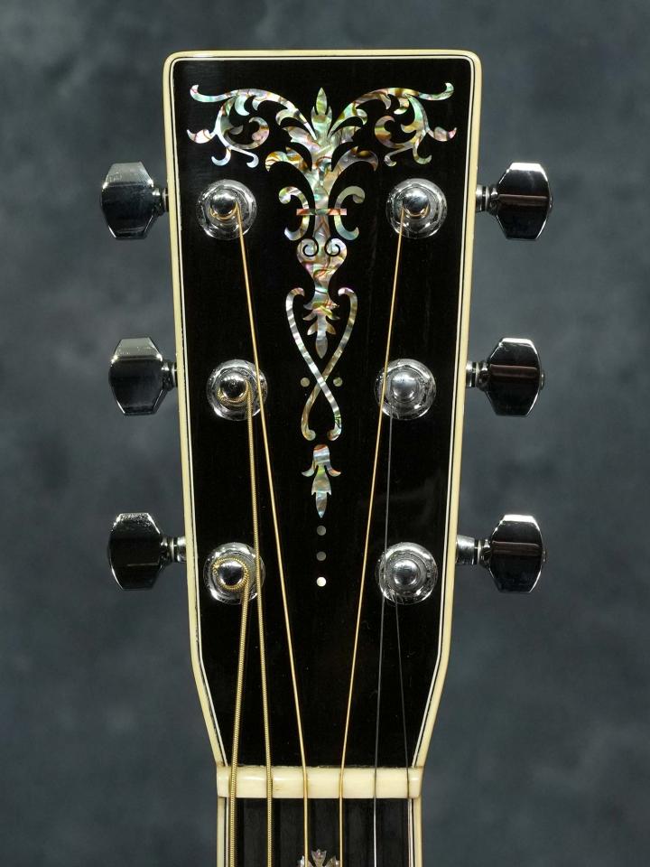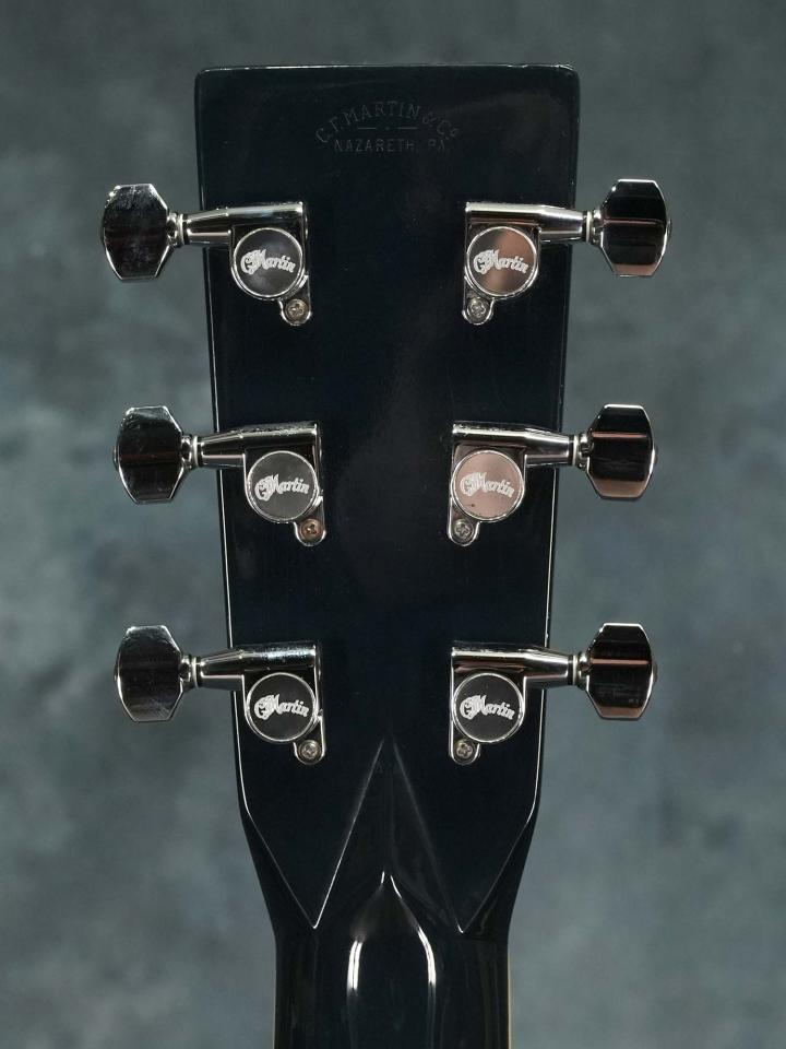 ヨーロピアンスプルースTop&イーストインディアンローズウッドSide/Backのオーディトリアムボディにスキャロップブレーシング、ナット幅45.1mm(実測値)でソフトなVシェイプのマホガニーネック、スノーフレイクインレイの入ったエボニー指板、エボニーの突板にトーチインレイの入ったヘッドストック、エボニーブリッジ、Martinロゴ入りロトマチックチューナー。