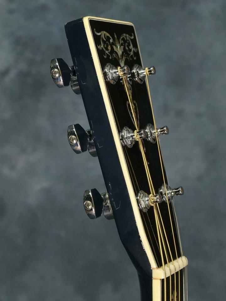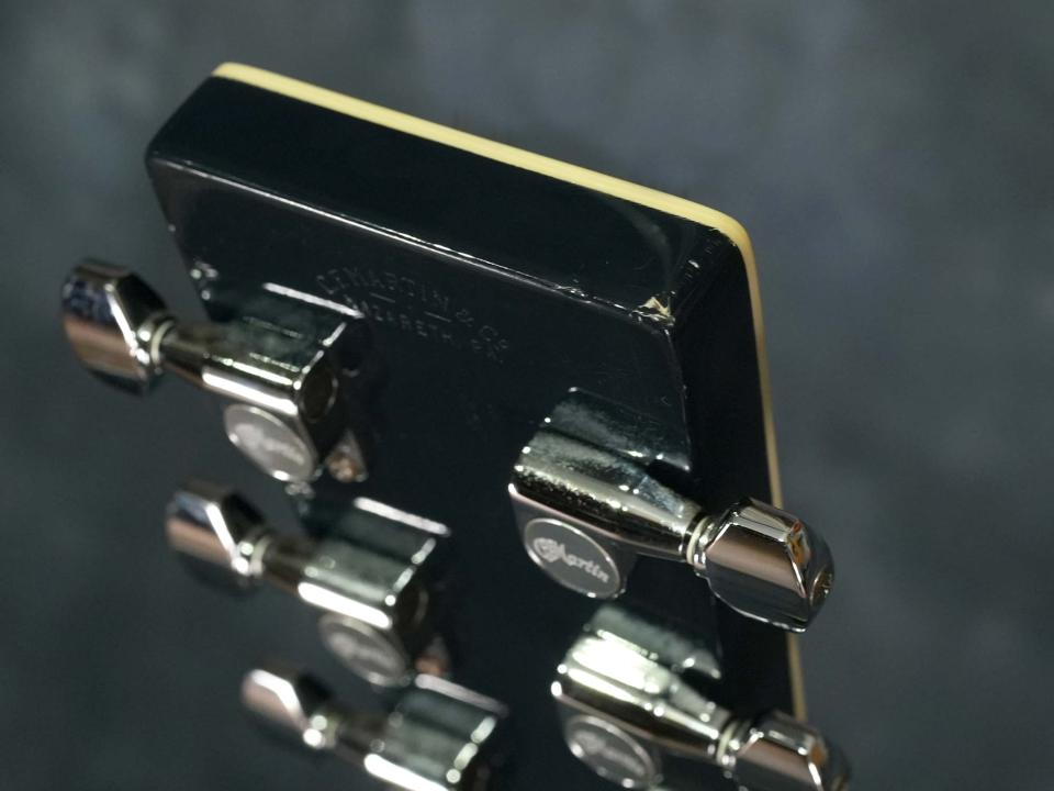 Martinの宿命とも言えるバインディング剥がれが修理されており、バインディング周辺の塗装も含めた丁寧な修理が行われています。6弦側のヘッド裏角に塗装の割れを伴う打痕が有り、ブリッジ周りの塗装が若干浮いいるう上で経年によりボディトップにはウェザーチェックが入っていますが、その他には大きなダメージや木部の割れ/剥がれの修理歴などは有りません。