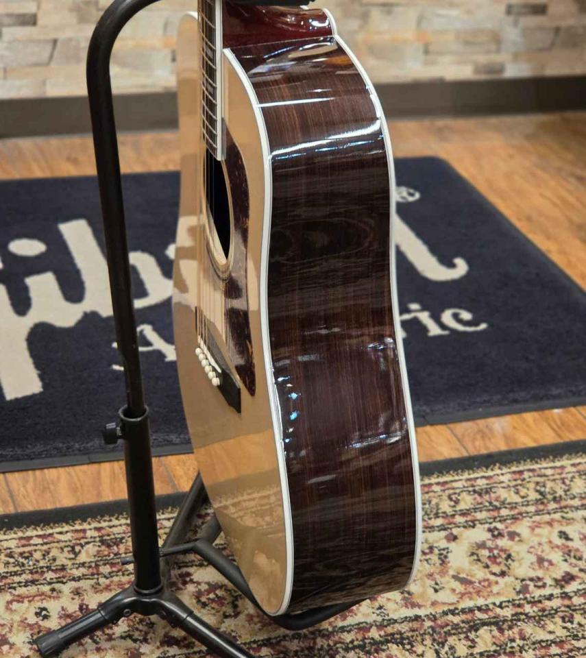 深く包み込むような低音と、空気に溶け込むように伸びていく高音。その両方をバランスよく兼ね備えたGuild D-55は、アコースティックギターに求められる理想像に近い響きを感じさせてくれる一本です。ひとたびコードを鳴らせば、ふくよかで厚みのあるサウンドが心地よく広がり、単音では輪郭の整ったクリアなトーンが印象的に立ち上がります。その音色は派手すぎることなく、それでいてしっかりと存在感を感じさせ、弾き手のニュアンスを丁寧にすくい取ってくれます。