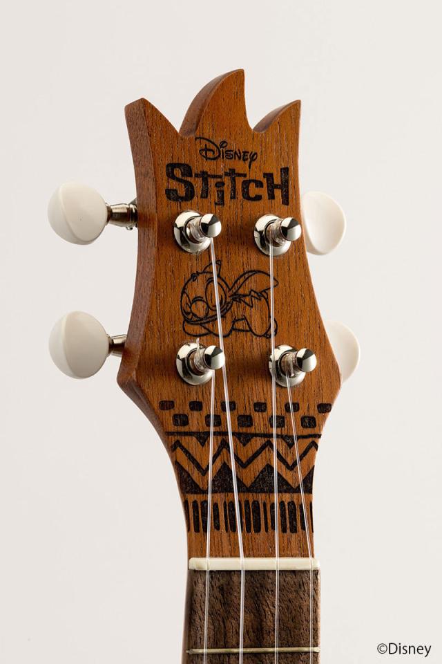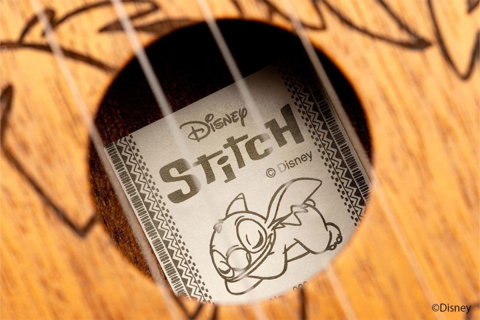 パイナップル型のヘッドヘッド部分にもスティッチの姿があり、シリアルナンバー入りのオリジナルラベルがサウンドホールの中につきます。
