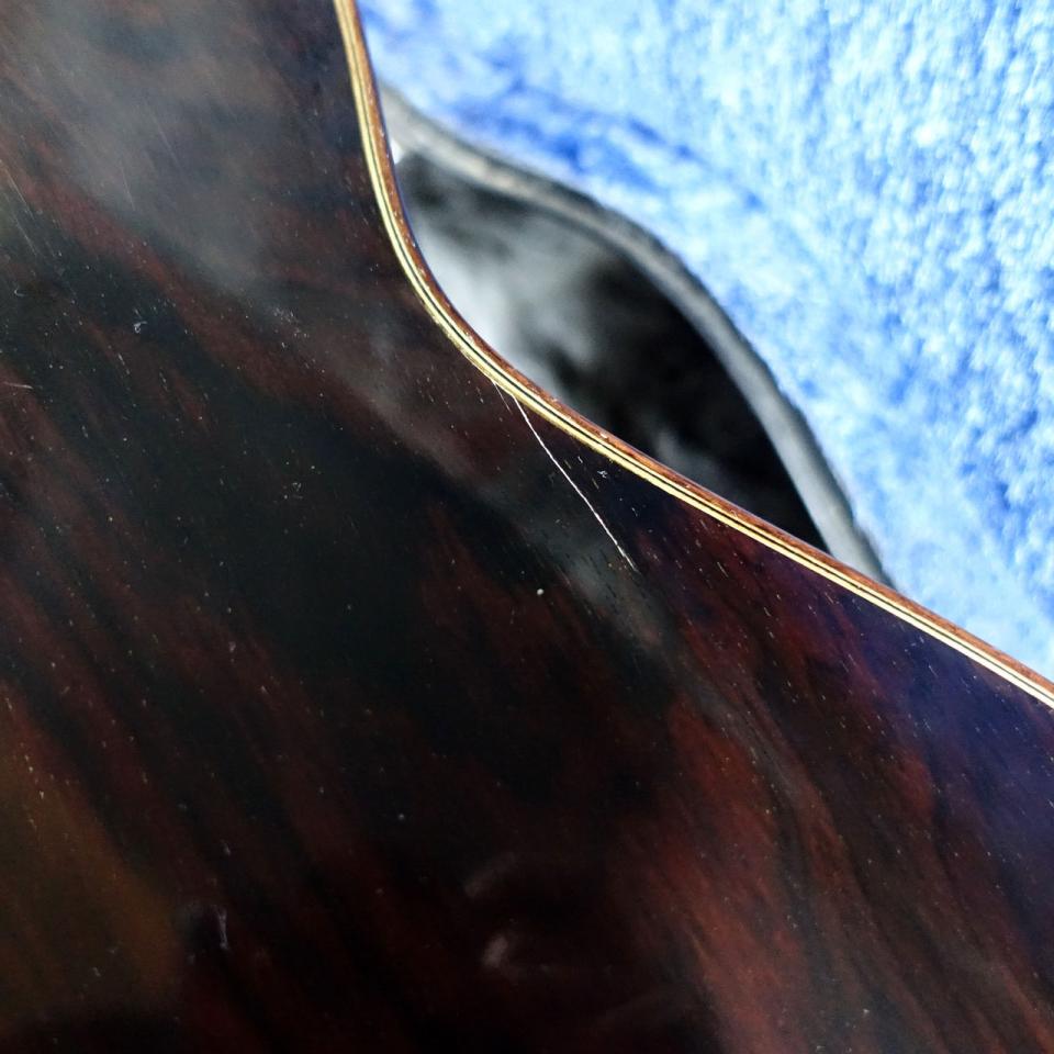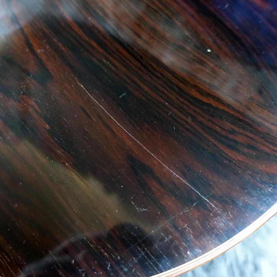 トップ材にスプルース単板、サイド材は内側にシープレスを貼り合わせたハカランダのダブルサイド構造、バック材はハカランダ単板となります。