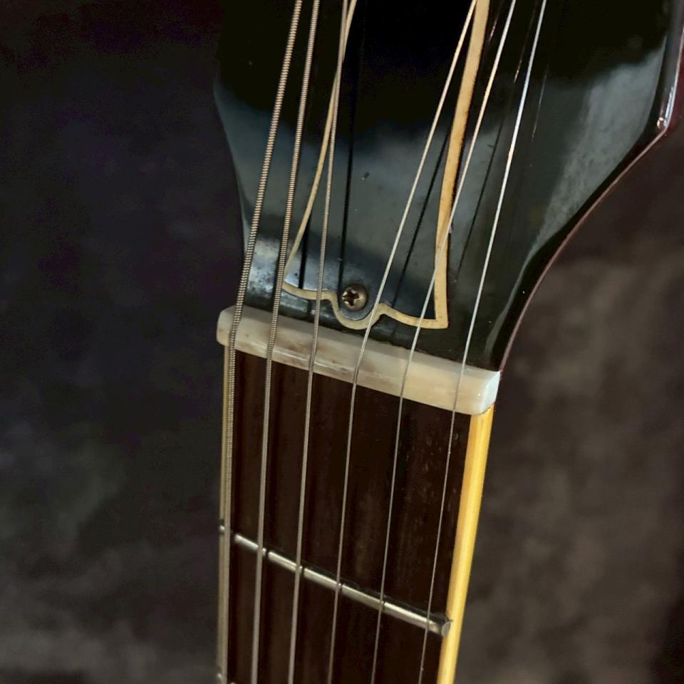 4弦ペグとナットは交換されています。ピックガードは欠品しておりますが、むしろすっきりとしたトップビューが好みの方には好印象かもしれません。