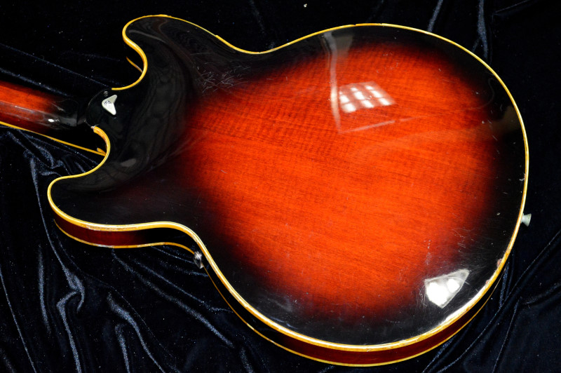 画像にあるように6弦側のFホールカバーが外されています。ハードケースが付属します。重量は約3.85kg。