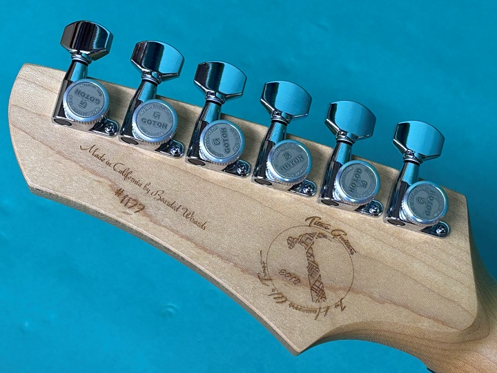 ボディはバスウッド、ネックはメイプル、指板はウェンジのラウンド貼り、ピックアップはLOLLAR製でフロントにGold Foil、リアにCHICAGO STEELで、共に2018年製がマウントされております。ペグはGOTOH製 ロック式ペグが採用されております。