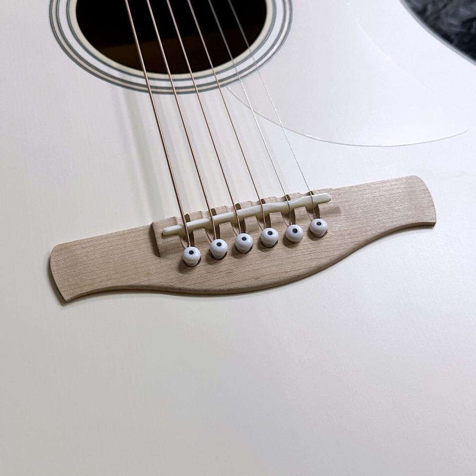 ウッディ&ホワイトでコーディネートした白いエレアコ!美しいルックスのみならず、抱えやすいボディシェイプ、演奏者へダイレクトにサウンドを届ける、A.I.R. ポート搭載など洗練されたモデル。