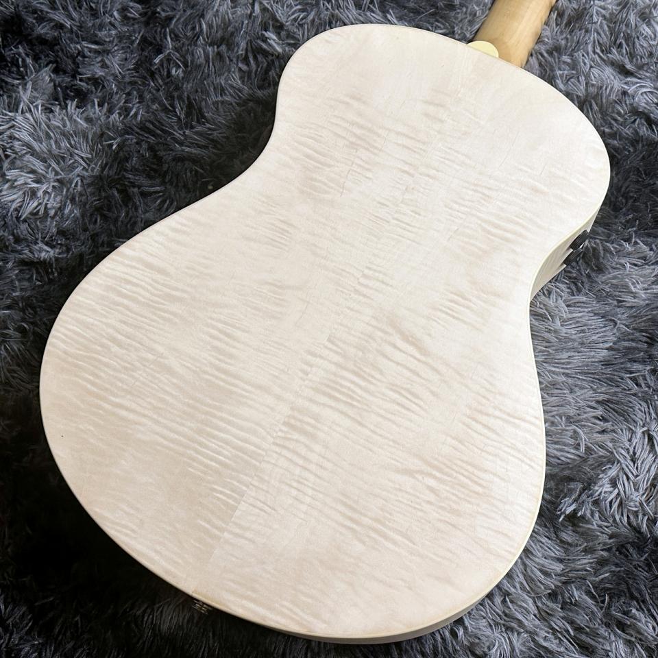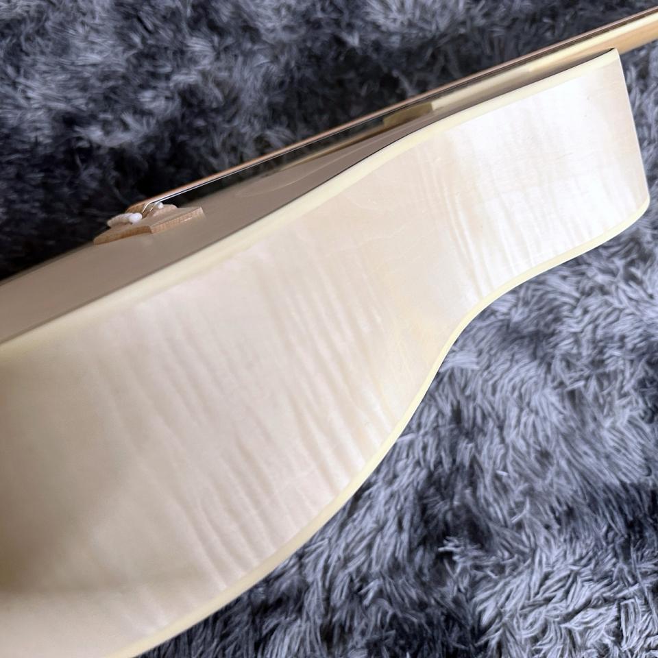 TOPにはオール ・レンジに渡ってバランス良いサウンドが特徴でアコースティック ・ギターのトップ 材としては定番のシトカ ・スプルース単板材を、ボディ BACK&SIDE には 表情豊 かなフレイム ・メイプル 材 を 採用 しました 。いずれも木のナチュラルな美しさを大切にしつつ可憐な白さを表現したオープン ・ポア ・アンティーク ・ホワイト(艶消し)で仕上げています。