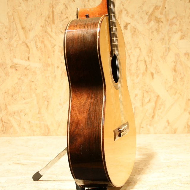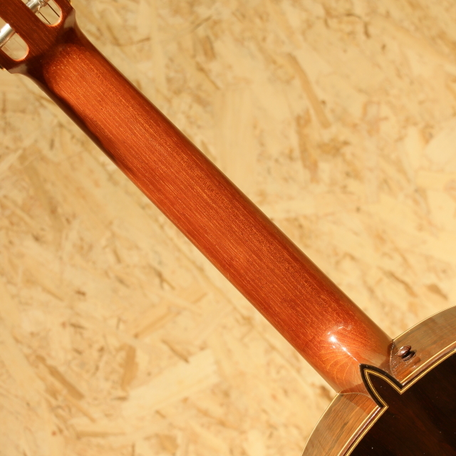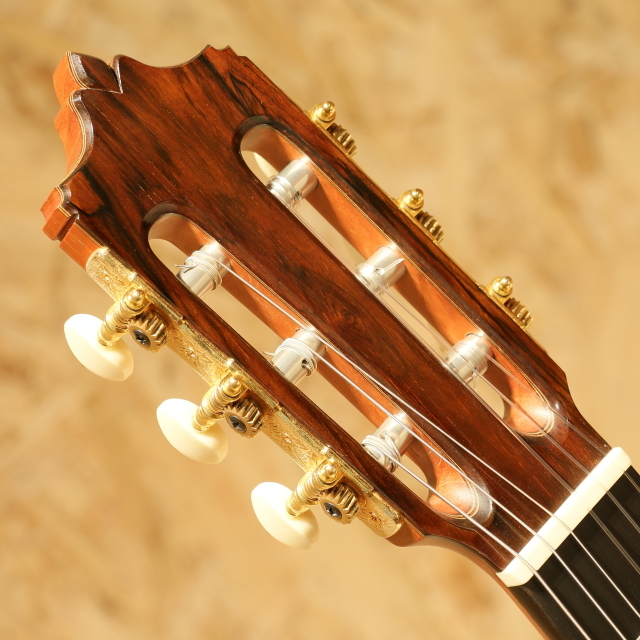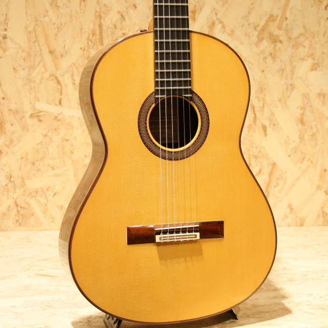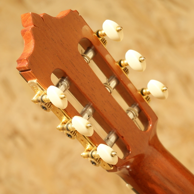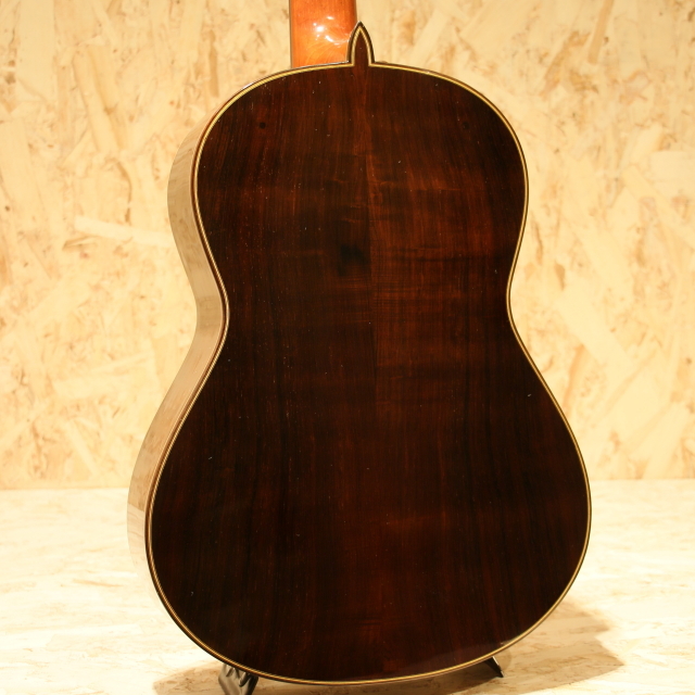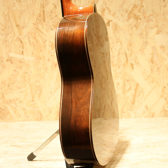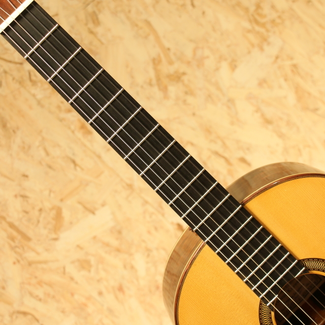 日本を代表するベテラン製作家、"黒澤澄雄"氏の後継者である"黒澤哲郎"氏。スペインでマリアノ・テサーノス、テオドロ・ペレスに師事し、グラナダの名工アントニオ・マリンの工房で塗装技術を学ぶなど、本場スペインの製法を身の上にして伝統に則ったギターを生み出します。海外からの評価も高く、国内でもトップクラスの製作家のひとりと言えます。本器は高級モデルの"Especial"。2003年製のUSED品です。ドイツ松単板表板、中南米ローズウッド単板側&裏板、黒檀指板、ローズウッド駒、ゴトー製ゴールドペグ、ファンブレイシング、セラック塗装、弦長650mm。この個体で特徴的なのはサウンドホール内のラベルが2つある事。製作時に貼られた”澄雄氏の息子”名義のものと、後年になって貼り付けられた”哲郎”氏ラベルが同時に存在する個体です。哲郎氏に確認したところ後年リペアの際に当時のオーナー様から頼まれて貼り付けたとのこと。初期ラベルと後年のラベルを見比べられる貴重な1本です。自身の父澄夫氏の元で学び、本場スペインで新たな教えや気付きを得て、それら全てを糧にギターを創る哲郎氏。スペイン的な深いサウンド、切れ味の良いカラッとした独特の響きを引継ぎ、日本的な輪郭のハッキリとしたサウンドを併せ持ちます。本器ESPECIALは巨匠トーレスの構造を参考にして力木配置を見直したモデル。単音での分離の良さや遠達性を重視した設計です。タッチの感覚がそのまま前に飛び出してくるようなレスポンスの良さを持ち、輪郭もハッキリとした出音。音色のバランスも良く、深く重みのある低音成分に澄み渡った高音成分と幅広いレンジ感で響いてくれます。表情も多く表現力の高いギター、演奏で出来ることの増える弾きごたえのある1本です。ネックヒール付近のボディサイドにストラップを付けるためにエンドピンが取り付けられています。過去にブリッジを貼りなおしたのか、ブリッジ縁の塗装が薄く剥がれていますが、現在ではブリッジ剥がれなども無く使用する上で問題はございません。その他ボディショルダー箇所に僅か爪が当たった跡など見られますが、全体を通して使用感の少ないと言えるコンディションを保たれた本器。後付けにて搭載されたパッシブタイプのコンタクトピエゾピックアップ。トップ面に貼り付けられ振動を拾うことにより、よりナチュラルで奥行きを感じるラインサウンドをアウトプットします。ネックコンディションは問題なくサドル残りも充分、演奏性良好な1本です。国内トップクラスの製作家が創る良質な国産クラシックギター。本場の風合いを感じられるサウンドは必聴です。ぜひご体感ください。汎用のハードケースが付属します。