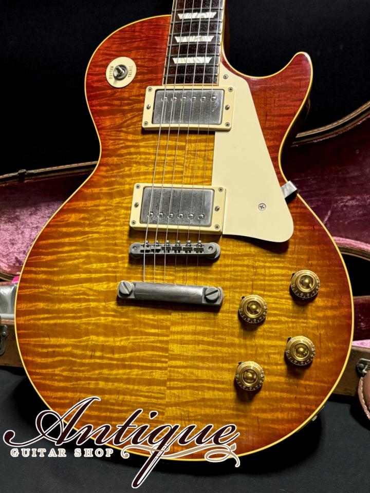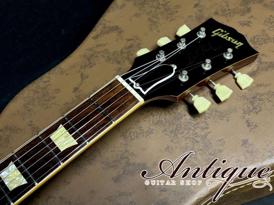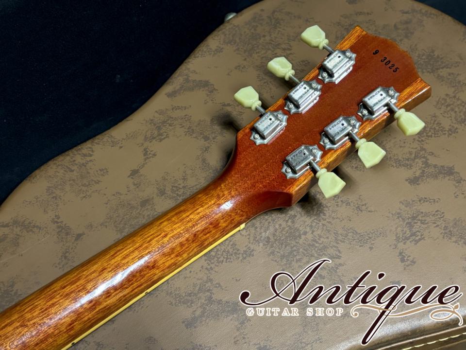 今回ご紹介させて頂くのは、そのヒスコレの最高峰とも称される2003年の1959 BZFモデルの中でも特に稀少極まり無い一本。シリアルは#9 3025(プロトを除く製作19本目)、当時本国アメリカの有名ショップが、BZFモデルの発表に先立ち店頭展示用として飾られていた一本を、国内ショップのオーナーが現地まで出向いて特別に入手。何年かは非売品としてそのショップにて保管されておりましたが、長く付き合いのありましたファーストオーナー様が頼み込んで譲り受け、その後現在に至るまで大切に保管されてきました。その内容は他とは完全に一線を画しており、オリジナルのヴィンテージを除けばレスポールモデル史上の中でも最高峰に位置すると言っても過言では無い一本。更には23年前の製作品ながらに、ハンダバージンのフルオリジナル、年式を感じさせない極上ニアミントとなる究極のコレクタブルアイテムとなります。