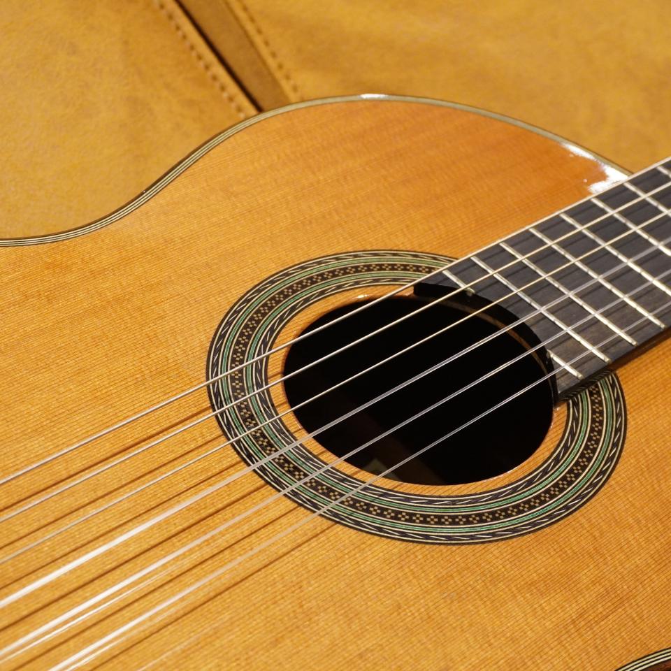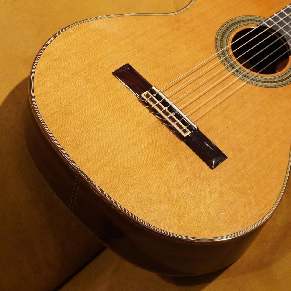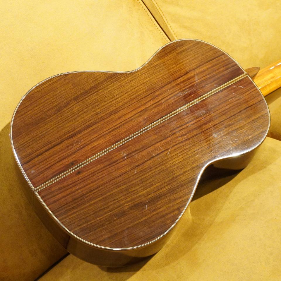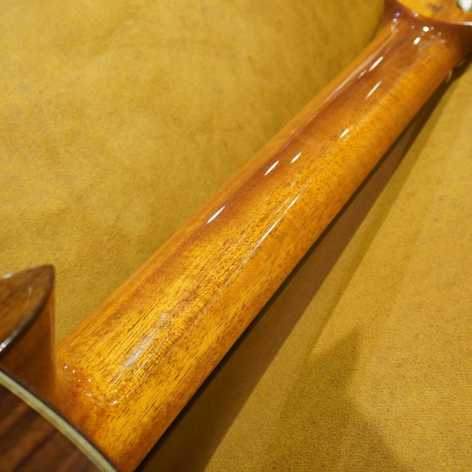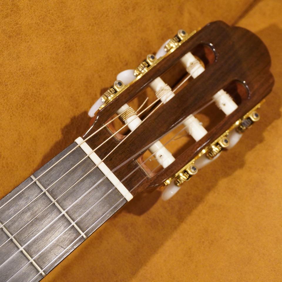 本器は、表板にシダー(杉)、側・裏板にローズウッドを採用した「オール単板(総単板)」仕様です。合板モデルとは一線を画す、深く豊かな音量と、単板ならではの遠鳴りする響きが特徴です。