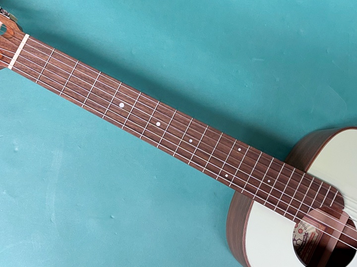 当店入荷後に各部調整済み。12フレットでの弦高は、6弦:3.6mm、1弦:2.8mmと、数値だけを見るとやや高めですが、610mmスケールのためバランスが取れており、押弦のしづらさは感じません。フレットの凹みも見られません。サドルにも十分な余裕があり、当面はメンテナンスフリーでご使用いただけます。