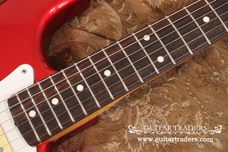 This model recreates the 1962 Stratocaster, featuring a slab-jointed rosewood fingerboard and a body finished in