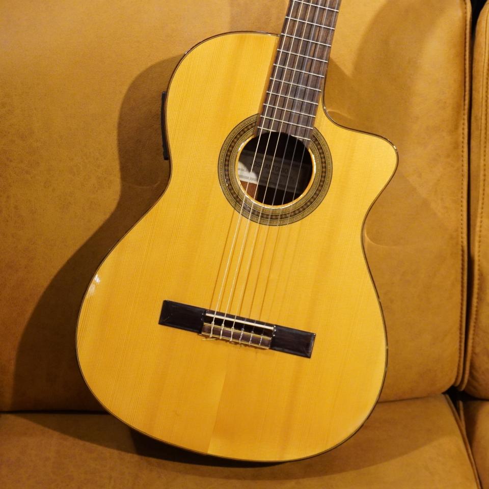 シダー単板トップ×ローズウッドサイド&バック。甘く立ち上がる中低域と、艶のある響き。カッタウェイ仕様で演奏性も高く、ステージで輝くー本。