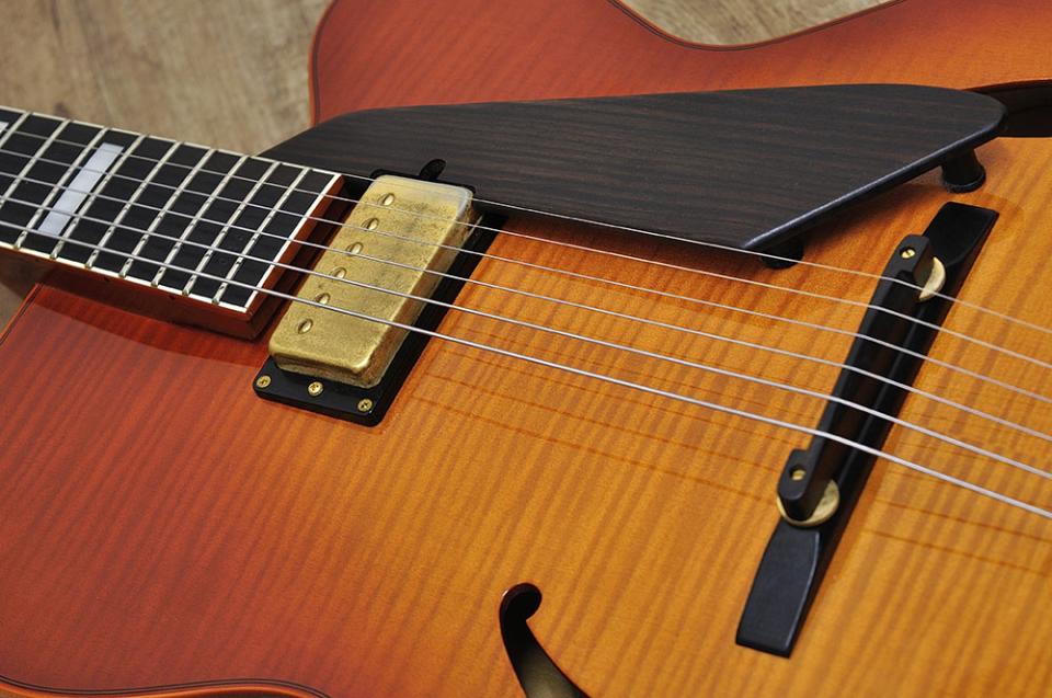 ピックアップにはボディマウントタイプのハムバッカーを搭載。しっかりとした出力と安定したサウンドを確保しつつ、フルアコ特有のエアー感や箱鳴りを活かしたナチュラルなトーンを出力します。クリーンでウォームなジャズトーンはもちろん、幅広い表現に対応可能です。