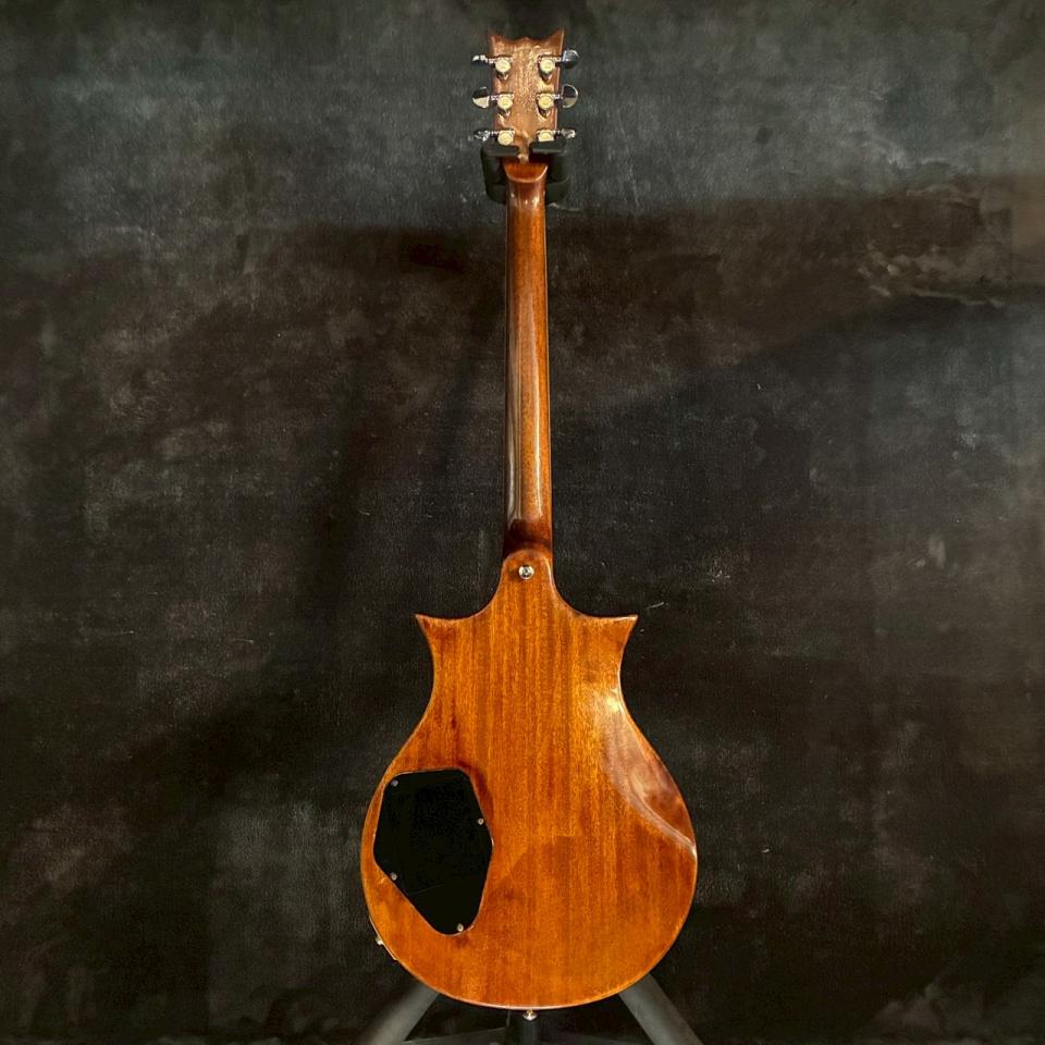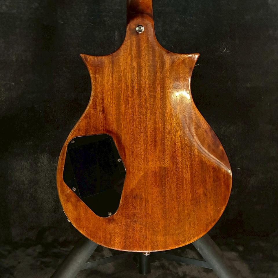 メイプル+マホガニーボディにマホガニーネック、さらにエボニー指板という贅沢な構成も魅力です。立ち上がりの良さと芯のある中低域、エボニーならではの引き締まったレスポンスが合わさり、クリーンでは輪郭のある艶やかなサウンド、ドライブ時には粘りと押し出し感のあるトーンが楽しめます。