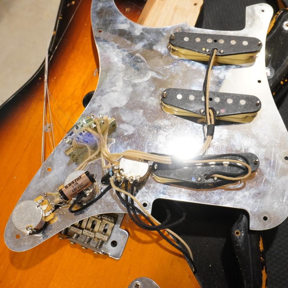 ハカランダの様な艶の有る黒々とした指板に、気合いの入ったレリックが施されたアルダーボディを組み合わせたショップオーダー品と思われるモモセ"MST1-STD"が入荷しました。ネック材にも適度にフレイムの入った良質なメイプル材が使われており、非常に雰囲気の良い1本でございます。コンディションとしてはストラップピンがロックピンに交換、ボディには後から付いた傷も有りそうですが、不自然な傷等は無く抜群のルックスに仕上がっております。