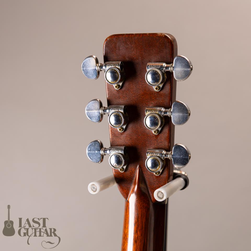 ネックまわりにつきましては、約43ミリのナット幅に、程よい厚みのVシェイプで握った感触はすごく良いです。ブレイシングは、ノンフォーワードのノンスキャロップXブレイシングで、力強くしっかりとしたサウンドを生みます。トラスロッドは、Tバーロッドで、黄金期のテイストを感じることができると思います。この頃の丸ヘッドやべっ甲柄ピックガードのもまた良いですね。サドルは、スロットのショートタイプです。ペグは、PAT. PEND. U.S.A.刻印のグローバーで、現在動作は問題ございません。