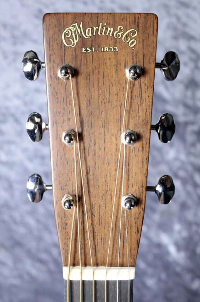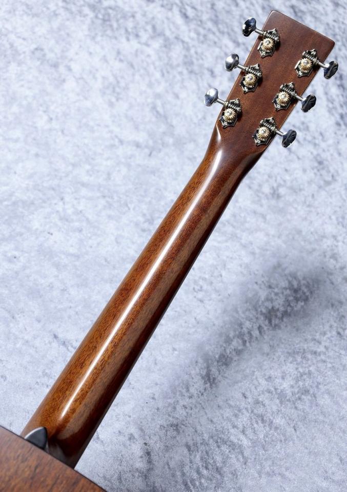 【D-18Authentic1937】長い歴史と数えきれないほどの画期的な発明により、世界中のアコースティックギター・メーカーが”スタンダード/基準"と呼ぶギターを作り上げてきたマーティン社。そのマーティンギターの中でも幅広いジャンルに溶け込むクリアで立ち上がりの良い、パワフルなサウンドから多くのアコースティックギタープレイヤーに愛されているD-18。1934年に14フレットジョイントのD-18が生産されて以来D-28と共にMartinGuitarを代表する人気モデルとして現在でも生産を続けております。D-18Authentic1937は1937年当時426本製造され、現存数の非常に少ない希少な1937年製D-18の仕様を忠実に再現しています。その当時新品で店頭に並んでいたそのままの状態をタイムマシーンで現代に持ってきたかのような、当時の仕様を完全に復刻することでサウンドまでも再現した現行品とは一線を画した魅力的なモデルです。材構成としては、VTS加工を施されたアディロンダック・スプルーストップとマホガニーのボディの組み合わせ。この組合せが放つサウンドは粘り気がありギター全体で音を響かせているような大きな迫力とキレの良さを持っており他の楽器との馴染みやすいクリアなサウンドを一段と極め、しっかりと存在感のあるパワフルな響きに昇華させたような印象を持ちます。さらに現代の仕様ではめったにない44.5mm幅ナットに対し非常に太いネックから、D-18の中でも特に音が太く単音でも埋もれない存在感のある響きが特徴。D-18Authentic1937を始めとするAutehnticシリーズはモデル名に冠される年代の完全復刻がテーマとなっており、当時のネックシェイプの再現・T-Barロッドのネック・ニカワ接着の仕様、さらにトップのアディロンダックスプルースにVTS加工(※)することで時間がたったような広がりと音量のある響きへと変化させています。