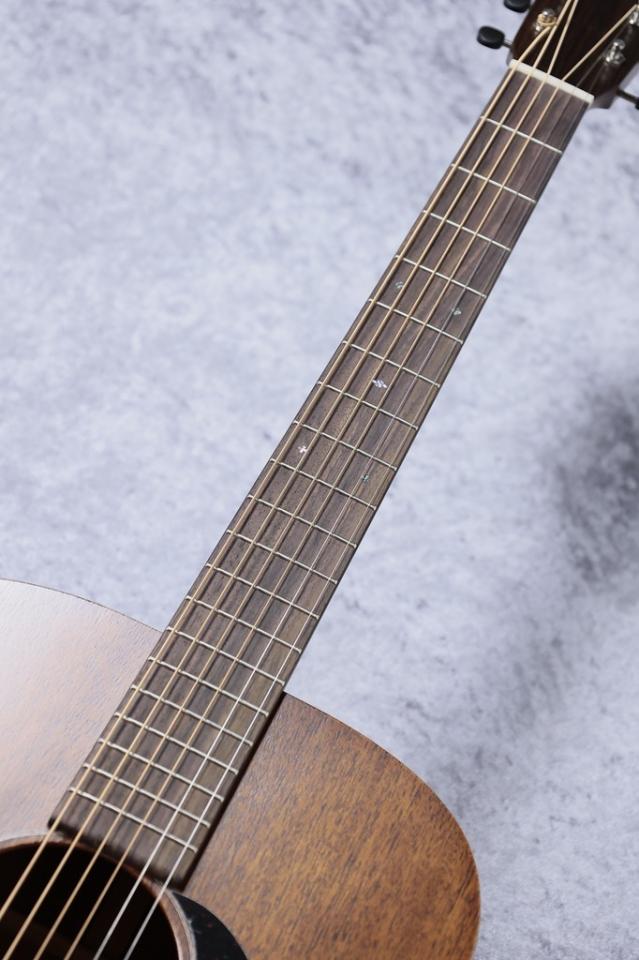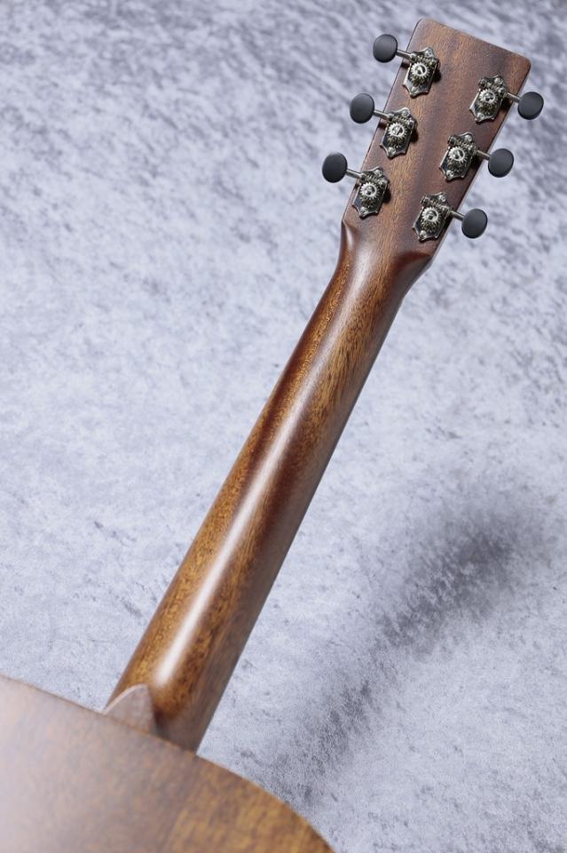 現在でも人気モデルとして定着している15シリーズですが、実は歴史を遡ると黄金期でもある1935年に誕生(SIZE 0)しております。小さいボディサイズで大きな音量で鳴ることから人気を博し1961年まで継続的に生産されました。並行して伴奏楽器として14フレットジョイントのドレッドノートサイズモデル(D-28、D-18)がMartin社から発表されるとドレッドノートサイズは現在のアコースティックギターの王道のサイズとして広く世界に知られることとなります。D-15MはD-28、D-18の迫力のあるサウンドと、0-15の大きな響きを掛け合わせ、1997年に生産が開始されます。長いMartinの歴史の中では比較的新しいモデルではありますが、現代の音楽の多様性に柔軟に対応できる軽快でいて煌びやかなサウンドと大きな音量、迫力のある低音を併せ持っています。マホガニーの立ち上がりの良いサウンドから強いタッチで弾くと少しザラついたラウドで割れるような独特の響きとなり、優しく軽いタッチで弾くときらりと、軽快なサウンドへと変化をしていきます。奏者のタッチにより大きくサウンドが変化する為、演奏に感情を載せやすく表現の幅が広がるモデルです。是非この機会にオールマホガニーサウンドをお試し下さい。