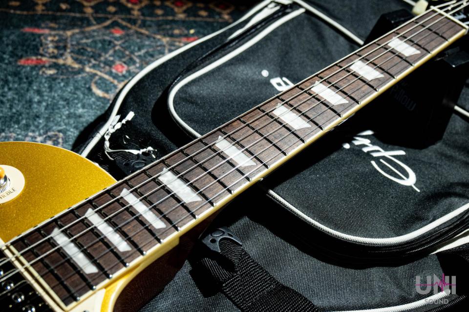 指板にはローズウッドを採用し、パーロイド・トラペゾイド・インレイと22本のミディアム・ジャンボ・フレットを備えています。