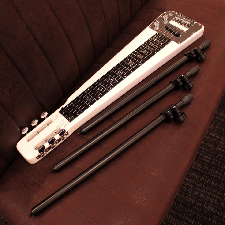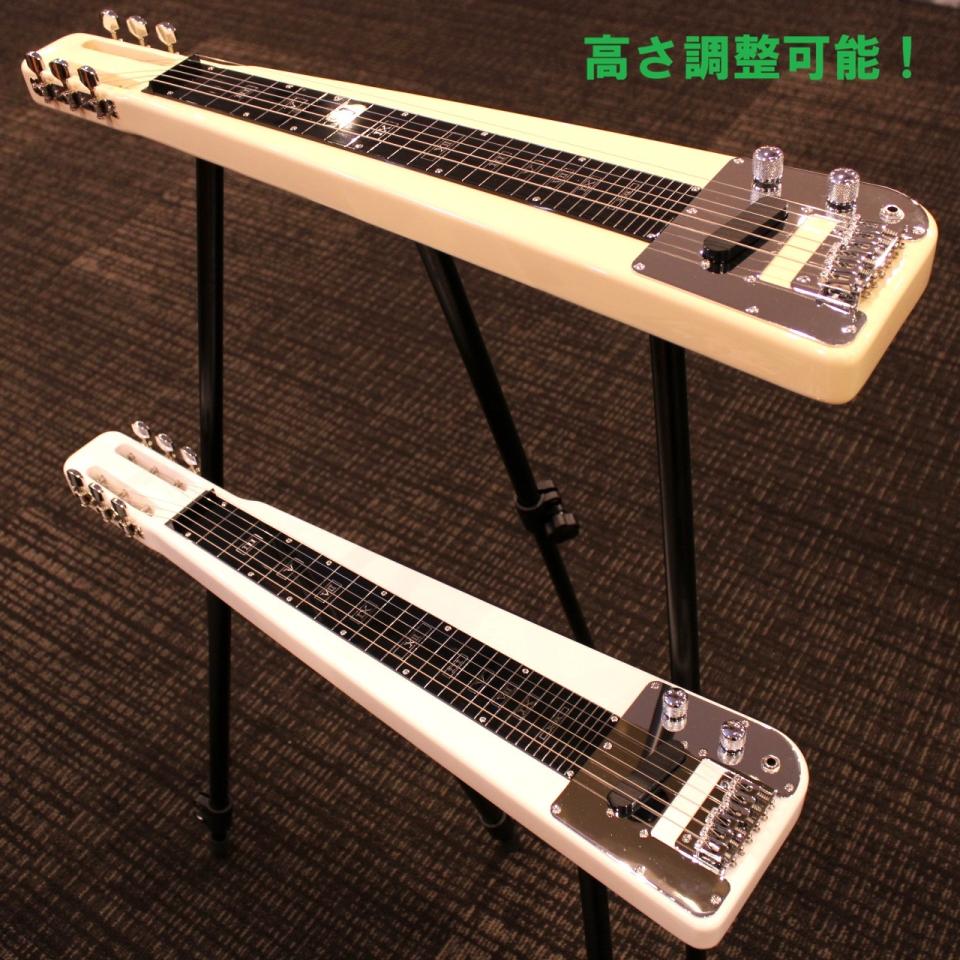 6弦仕様のスチールギター。膝の上に構えるスタイルはもちろん、付属の専用スタンドを使用することで立奏にも対応。