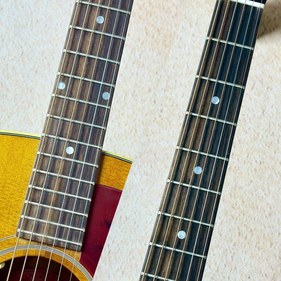 ローズウッド指板には、マザーオブパールのドットインレイが配置されています。