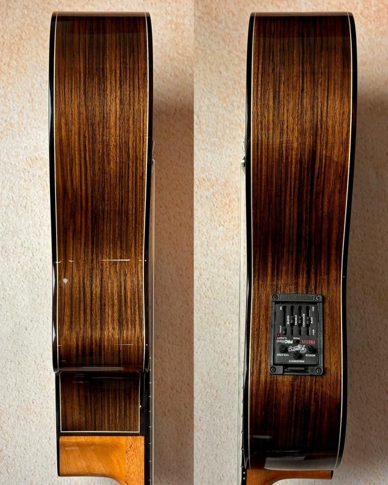 スプルース×ローズウッドの組み合わせにより、クリアさと奥行きを両立。生音でも十分な音量と遠達性を持ち、PU使用時もそのキャラクターを維持します。