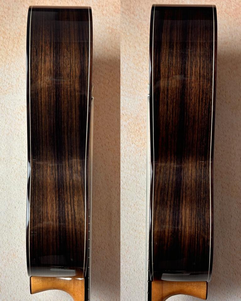 トップにスプルース単板、サイド&バックにローズウッド単板を採用。単板材は振動効率が高く、弾き込むほどに繊維が馴染み、音量・倍音・レスポンスが向上していく“育つ楽器”です。特に本機は、立ち上がりの速いクリアな高音と、深く沈み込むような低音がバランス良く共存し、和音でも単音でも輪郭を崩さない完成度を誇ります。
