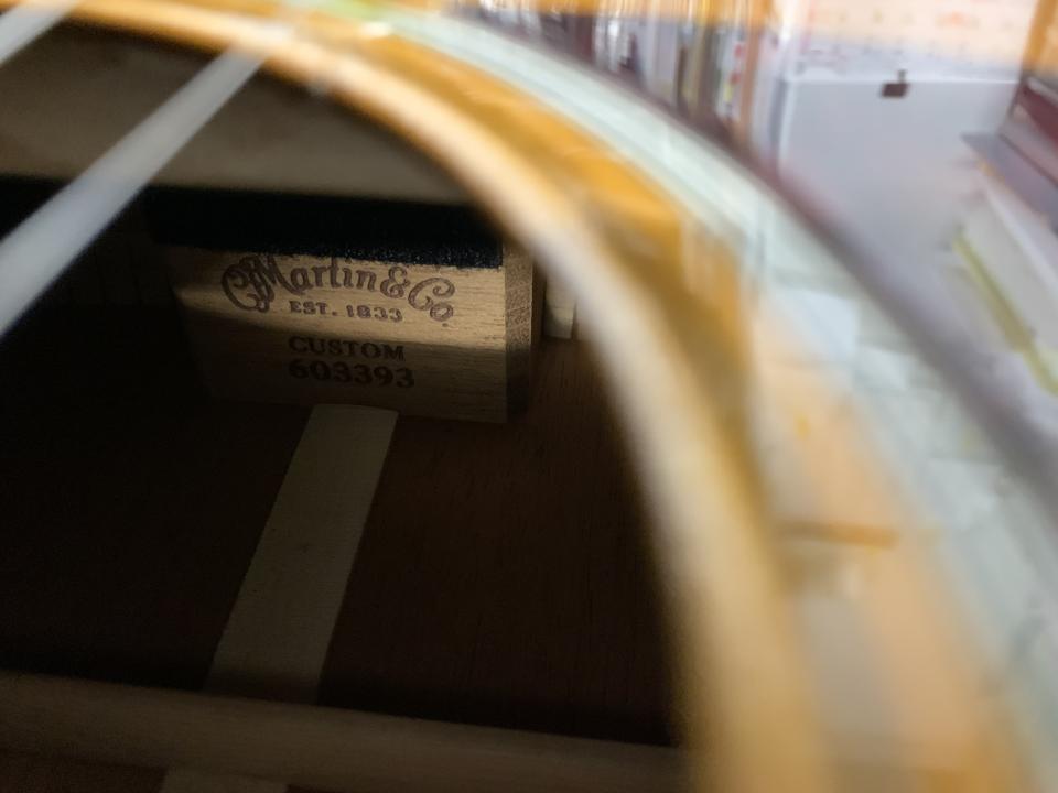 こちらはナット幅 44.5ミリ、SQロッドタイプの やや太めのグリップのCustomモデルで、ボディ1弦側 指板/サウンドホールにマーチンクラックの修理跡が見えますが キレイに直っています。(写真 4)