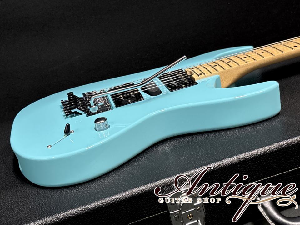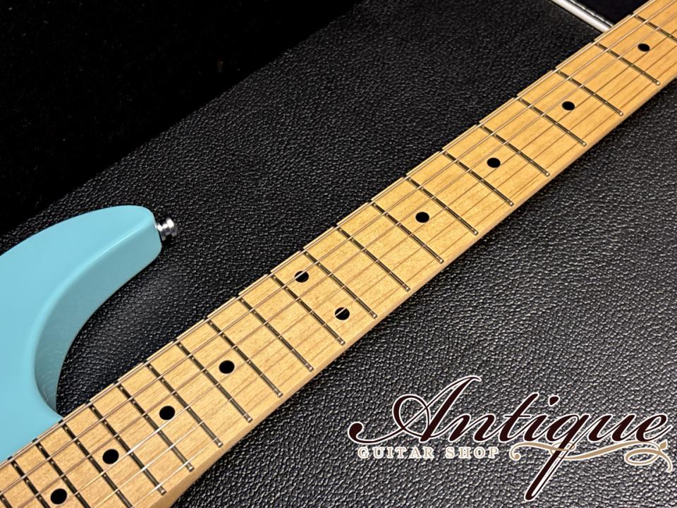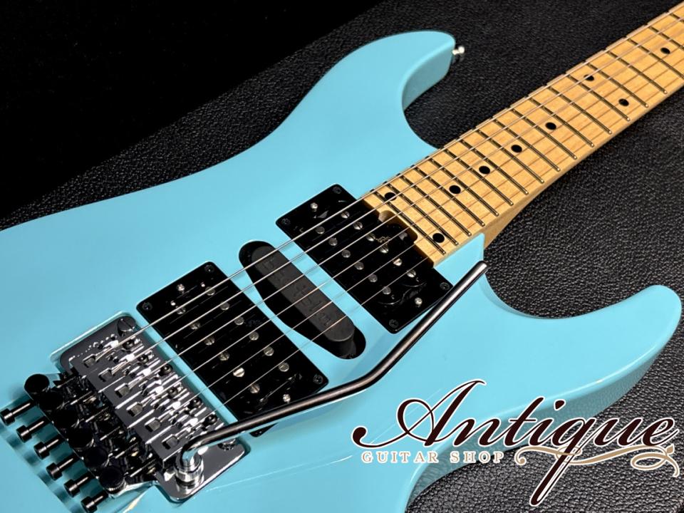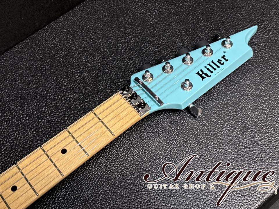 まずそのスペックとしては、ストラトよりも一回り小さい取り回しの良いボディシェイプを採用し、ボディ材には良質なマホガニーを採用。フィニッシュは本人も多く愛用している事で有名な人気のコンポーズブルーカラーとなります。ネックにはサウンド面への恩恵も大きい強固なハードメイプルが採用されておりますが、こちらは角度によって薄っすらながらフィギュアドフレイムライクなギラつきも確認出来る良質なメイプルにて、指板も同様にメイプルをラミネイトした所謂貼りメイプル仕様となっております。またKiller拘りのスペックとして、ヘッドはペグ配列が5:1となるお馴染みのキラーヘッドスタイルにマッチングヘッドフィニッシュ、ハイポジまでスムースな演奏を可能とするダブルカッタウェイ&ヒールレスカット仕様、ロープロファイル・セッティングを可能とする落とし込みダイレクトマウントのパーツ類、ボディとネックのジョイント方式はボディ裏から2点、フロント・ピックアップの下部から1点、計3点止めのトライポイント方式、その他演奏性の高い薄めのThin Uシェイプ&サテン仕上げ、24F仕様に、HSHレイアウトPU、D-Tunerを搭載したオリジナルフロイドローズなどが挙げられます。