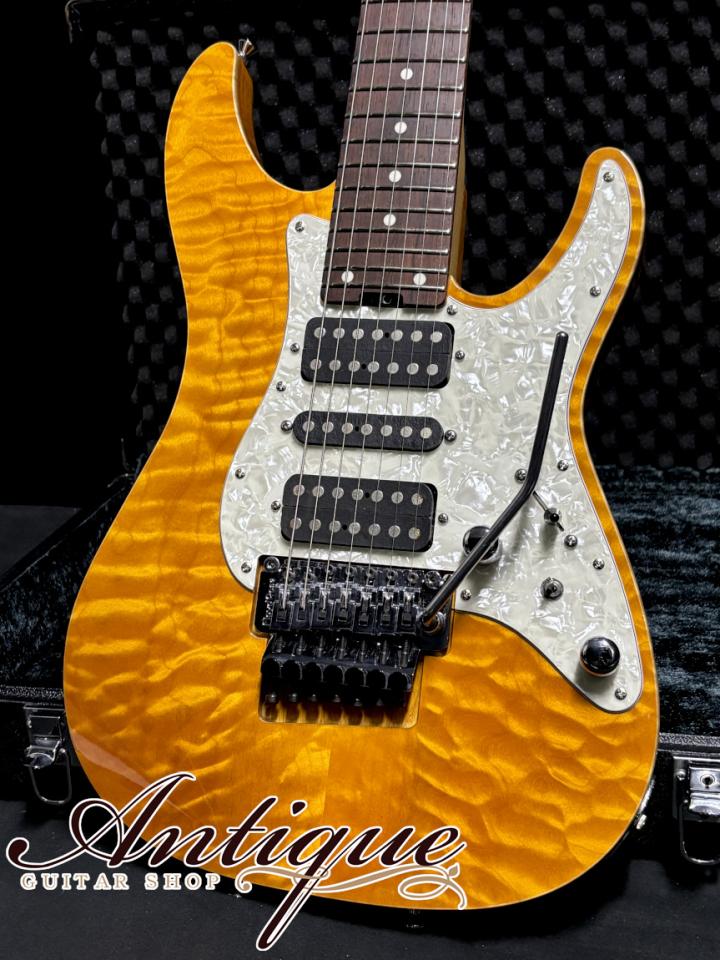 今回ご紹介させて頂くのは、数多くのモデルの中でも最上位機種として高い人気を集めるエクシードモデル。更にこちらの一本に関しては、AAAAグレードのキルトトップ、厳選されたスワンプアッシュボディ、ホンジュラスローズウッド指板と、最上位グレードに相応しい極上材の採用、HSHレイアウトにコイルタップ&スプリットトーンコントロール、オリジナルフロイドローズ仕様となるハイエンドスペック、そして通常の6弦仕様と比べても圧倒的に製作数の少ない希少な7弦カスタムモデル。更には6年前の製作品にも関わらず、殆ど使用感を感じさせない極上ニアミントコンディションの一本になります。