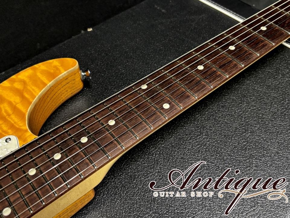 まずそのスペックとしては、ボディトップにはAAAAグレードの強烈なキルトが浮かぶ極上のキルテッドメイプルを採用。フィギュアドだけでなく縦ラインにもエキゾチックな杢目が浮かび、唯一無二の妖艶なルックスとなっております。フィニッシュにはハイエンドギターの中でも人気の高いシースルーのアンバーカラーにて仕上げられ、秀逸なキルトとのマッチングにて豪華かつ激渋のルックスとなっております。ボディバックにはインパクトの強い杢目を持つスワンプアッシュ材が採用されており、総重量は約3.74kgとこのスペックからは考えられない非常に軽量な個体となっております。ボディバックのカラーもトップに合わせたマッチングカラーとなっております。続いてネックはトーン重視のフラットソーン(板目取り)にて、角度によってフィギュアドライクなギラつきをもち、また硬質な材の証でもあるフレックラインが多数入った極上材を、そして指板にはポストハカランダとして名高い非常に濃いコントラストと強い黒の杢目が走るホンジュラスローズウッドを採用。ヘッドはボディ同様のキルトフィギュアド&マッチングカラーの贅沢仕上げにて、ブランドロゴプレートが取り付けられております。その他としては、豪華なルックスを更に向上させるパーロイドピックガード、ミディアムジャンボの24F仕様、リセス加工されたオリジナルのフロイドローズトレモロ、安定度の高いGotoh製チューナー、ネックエンド側のホイール・トラスアジャスト、フレットサイドは丁寧なロールド仕上げ、指板サイドはサイドスキャロップ、ヒーレスカットにカッタウェイ&コンタード加工と、まさにハイエンドの名に相応しい妥協を許さないハイグレードな一本となっております。細部スペックとしては、648mmロングスケール、49.4mmナット幅、ネック厚は1F:20.0mm、12F:22.2mmの薄めのプロフィール、指板ラディアスは14”となります。
