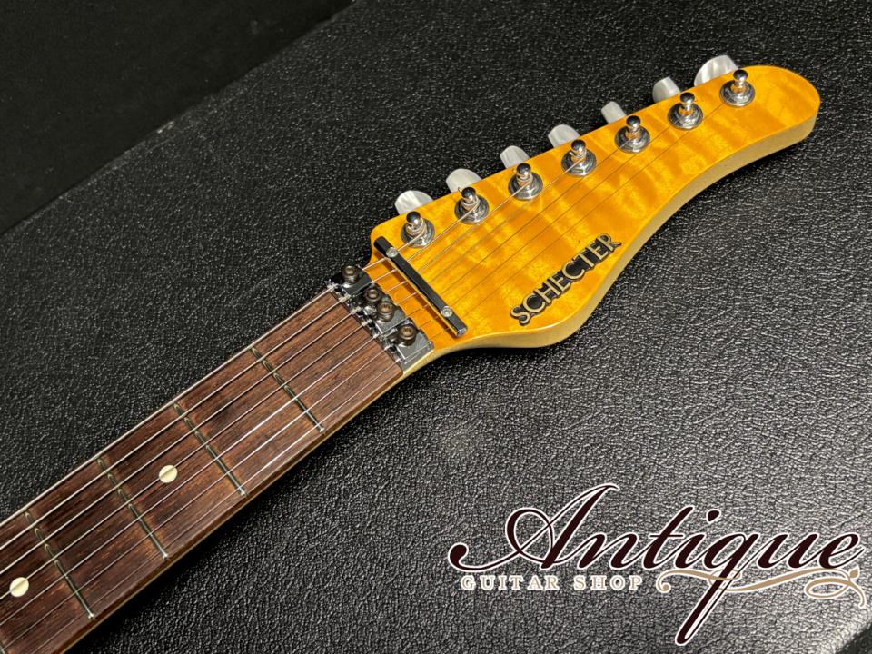 こちらの豪華なルックス&スペックに目を奪われがちですが、最高峰モデルの名はやはりサウンドにこそ感じられます。ピックアップはレアなHSHレイアウトにてSCHEXTERオリジナルピックアップを搭載し、シェクターの本領発揮とも言うべく攻撃的かつレンジの広いダイナミックなサウンドをアウトプットします。ピックアップ自体の出力は高めながらに倍音感豊かで液体のような滑らかなサウンド傾向となっており、クリーンでは澄み切った美しい艶のあるトーンと弾むような心地良さを、ドライブ時には音の芯がシッカリ残った分厚く図太いディストーションサウンド双方の魅力を持ちます。コントロールは1Vo、1Tone、5wayセレクターと直感的に使えるレイアウトながら、タップスイッチを搭載する事でシンプルながらに幅広いサウンドメイキングを可能とします。またリセス加工のされたフロイドローズトレモロによるフレキシブルかつ安定したアーミングプレイも愉しめる、ハイエンドらしい妥協を感じさせない一本となっております。