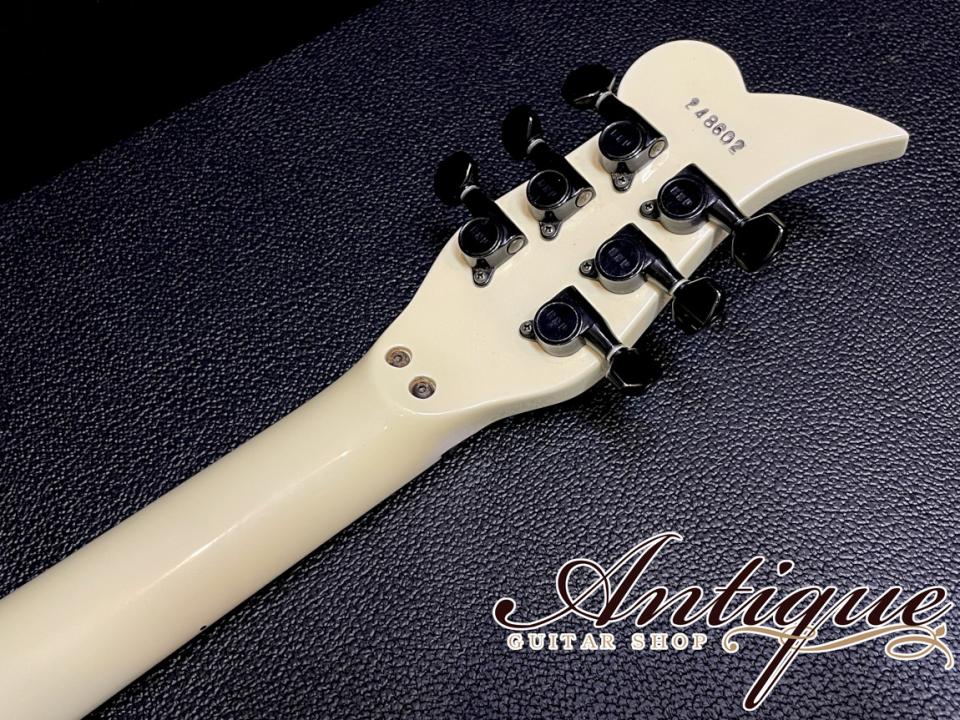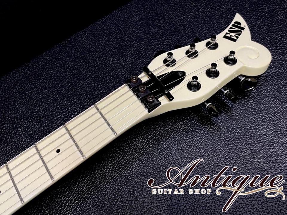 最後に状態としては、こちら上述の通りファーストオーナー様がプレイヤーではなくファンとしてコレクションされてきた一本となります為、通常の使用に伴うダメージや使用感は一切ございません。フレットもフレットガードを付けての保管の為99%コンディション、ピッキングスクラッチやバックルスクラッチ、演奏時に触れる金属パーツの劣化も殆どありません。ボディバックのパネルは2つも保護シールが付いたままとなっております。あえて神経質に見回してマイナス点を挙げるのであれば、オリジナルのギグバッグ内にて保管されていたものの、フレットサイドに小さな当て傷(15F低音弦側)、ヘッドの上部にゴマ粒以下の極小の塗装チップ、また経年による色焼け、ボディバックにはケースとの緩衝跡と思われる布スレのような跡が見受けられます。とは言え、現存する個体があること自体が驚きで、更には34年前の製作品という事を考慮すれば、これ以上のコンディションとなる個体は存在しないと断言出来るデッドストックコンディションです。付属品としても新品購入当時のままにて、オリジナルのギグバッグ、ESP発行の保証書等の一式(画像参照)が揃っております。