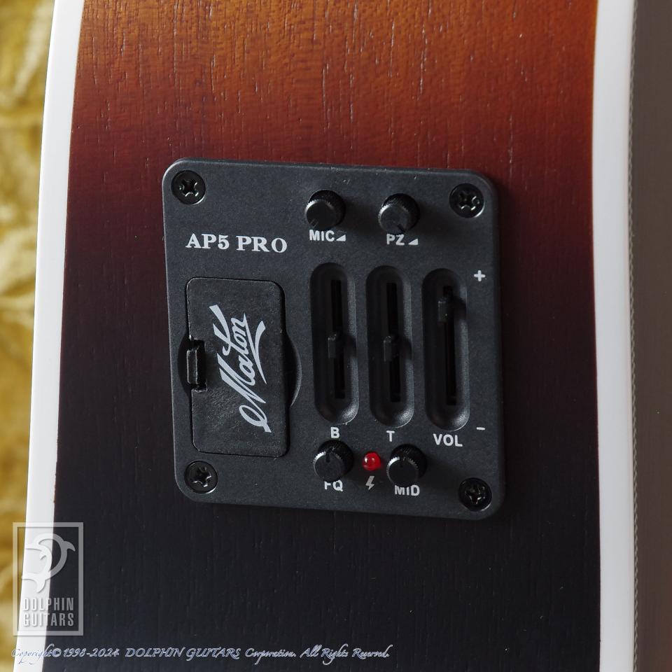 搭載されたAP5pro PUシステムは、オリジナルのアンダーサドルPUにコンデンサーマイクを併用する事により、奥行きのある音域と抜群なエアー感に加え、ボディーヒット音も余すことなくアウトプットします。また、高い出力を持つプリアンプを内蔵しておりますので、外部プリアンプ等を使用せずとも、そのままプラグインしていただければ極上のサウンドをお楽しみいただけます。PUとマイクVolは完全に独立しており、手元での出力バランス調整が可能ですのでお好みや現場に合わせてご使用下さい。