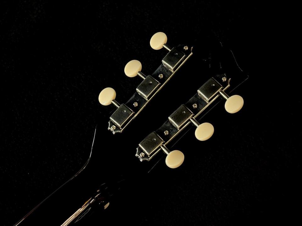Gibson製品と同形状のヘッドストック、アイボリーカラーのラージピックガードにはビンテージ仕様4点止めネジを再現(ダミー)。ペグボタン&バインディングも同じくアイボリーカラーでヴィンテージテイストを演出しています。ボトムベリーブリッジの上にはローズウッドサドルを見立てたブラックタスクサドルを直付けし、氏の愛用する1968年製仕様に近付けています。L.R.Baggs社製アンダーサドルピエゾピックアップがプレインストールされ、ネックエンドにはストラップピンがセッティングされておりますので即ライブでの使用が可能です!
