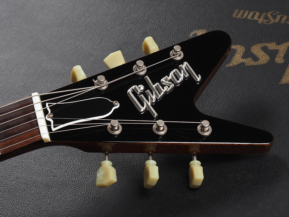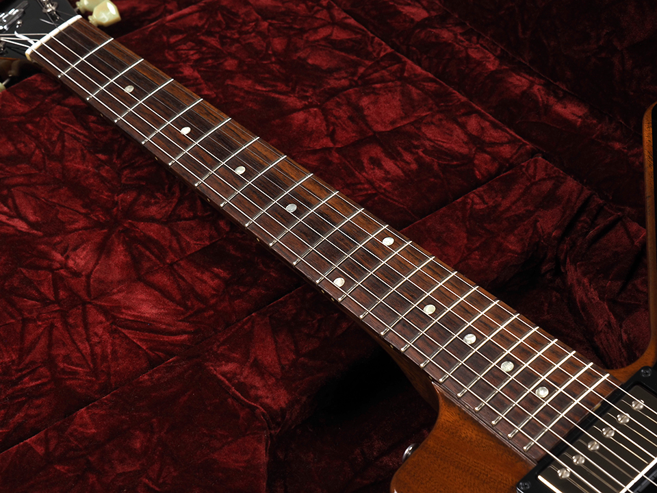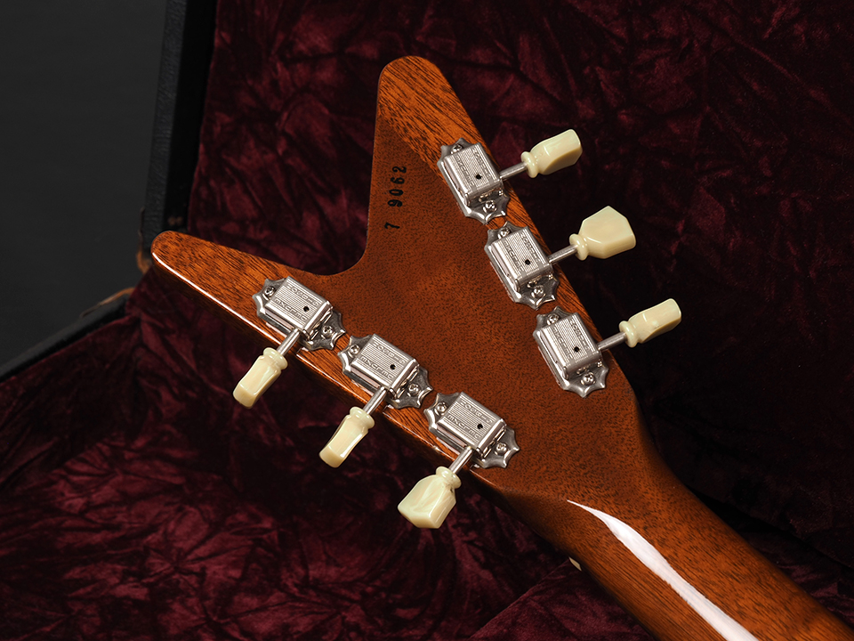 シャープなボディシェイプと特徴的なスプリットVヘッドは、後のExplorerへと繋がるデザインを色濃く感じさせるディテール。ナチュラルフィニッシュのマホガニーボディは木材の質感を活かした仕上がりで、シンプルながらも存在感のあるルックスに仕上がっており、ステージでも映える魅力的な印象を与えます。