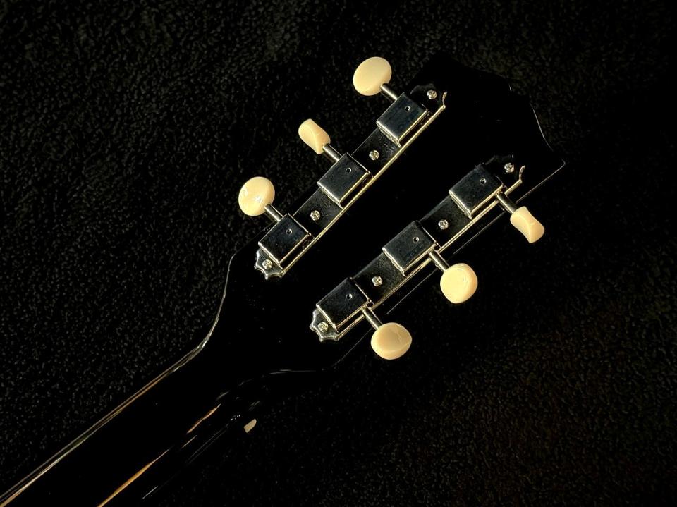 Gibson製品と同形状のヘッドストック、アイボリーカラーのラージピックガードにはビンテージ仕様4点止めネジを再現(ダミー)。ペグボタン&バインディングも同じくアイボリーカラーでヴィンテージテイストを演出しています。ボトムベリーブリッジの上にはローズウッドサドルを見立てたブラックタスクサドルを直付けし、氏の愛用する1968年製仕様に近付けています。L.R.Baggs社製アンダーサドルピエゾピックアップがプレインストールされ、ネックエンドにはストラップピンがセッティングされておりますので即ライブでの使用が可能です!