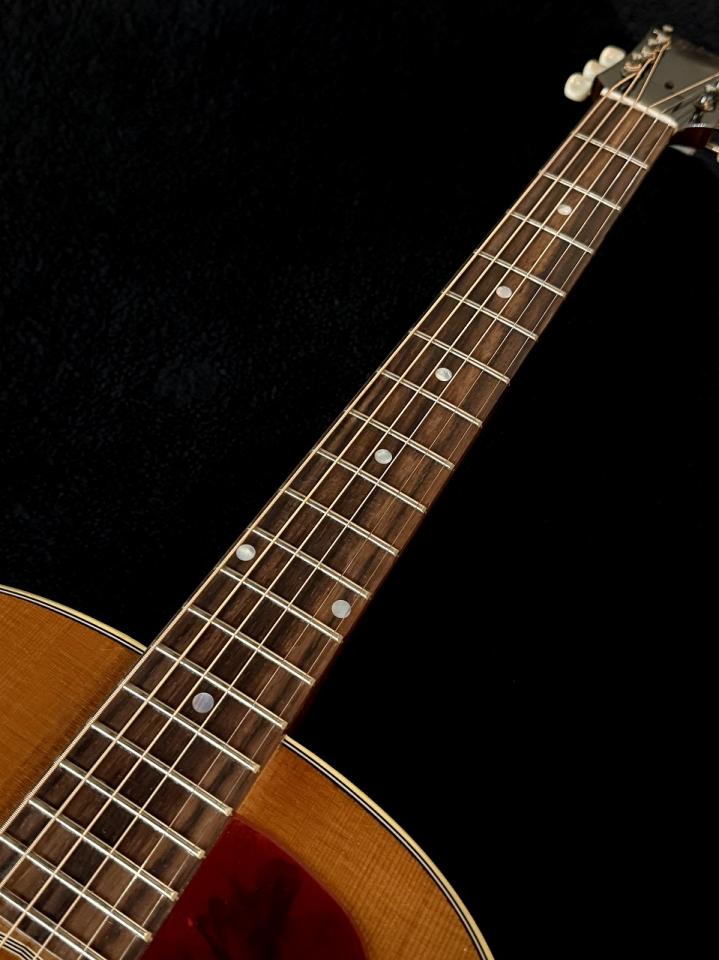 ローズウッド指板、ラージサイズのレジェンド・フレット、マザーオブパールのドットインレイが施されています。