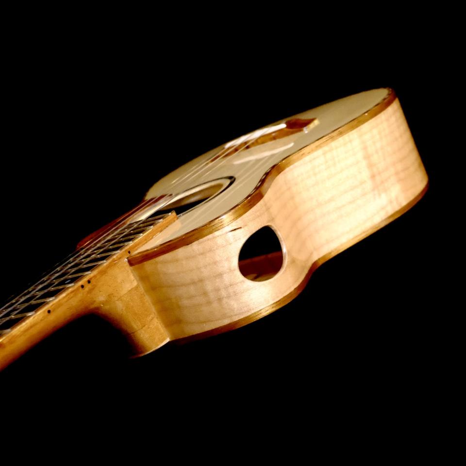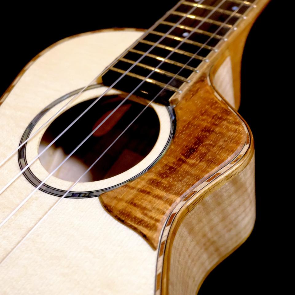 JAPANESEKOU ukulele、スイス"ムーン"スプルース・トップ、カーリーメイプル・サイドバックの小ンサートロングネック、カッタウェイ。