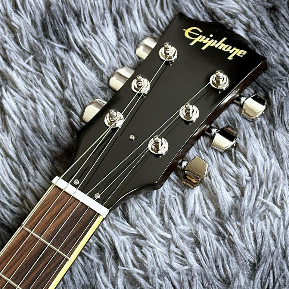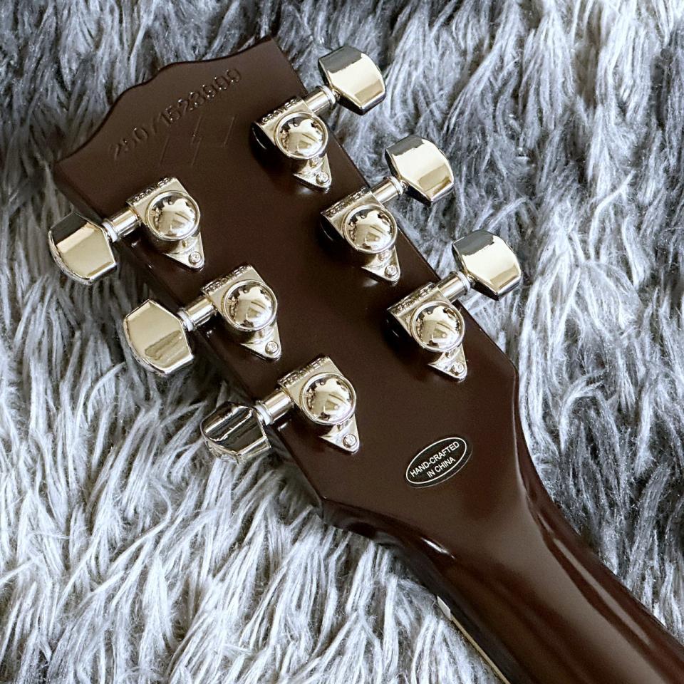 ヘッドストックはギブソン伝統の“オープンブック”スタイルを踏襲し、エイジド・マザー・オブ・パール素材によるEpiphoneロゴが埋め込まれています。チューニング時に滑らかな弦の滑りを実現するGraph Techナットとスペード・スタイルの Grover Rotomaticチューナーにより、優れたチューニングの安定性を実現しています。