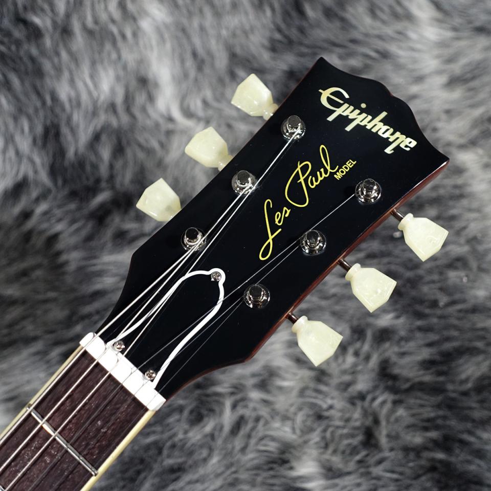 本モデルでは、ワンピース・マホガニー・ネック(ロング・ネック・テノン仕様)を採用し、豊かなサステインを実現。1959年ラウンデッド・ミディアムCネック・プロファイルを採用し、バインディングが施されたローズウッド指板を備えています。さらに、マザー・オブ・パールのトラペゾイド・インレイ、エイジド加工を施したEpiphoneロゴ、シルクスクリーン印刷されたゴールド色の「Les Paul Model」の文字が入ったギブソン・スタイルの“オープンブック”ヘッドストックを採用。サイドドットの位置やサイズも、1959年当時のLes Paul Standardと同じ仕様になっています。ジェニューイン・マホガニー材のボディにメイプル・トップが貼られ、トップには美しいAAAフレイムメイプル化粧板があしらわれています。