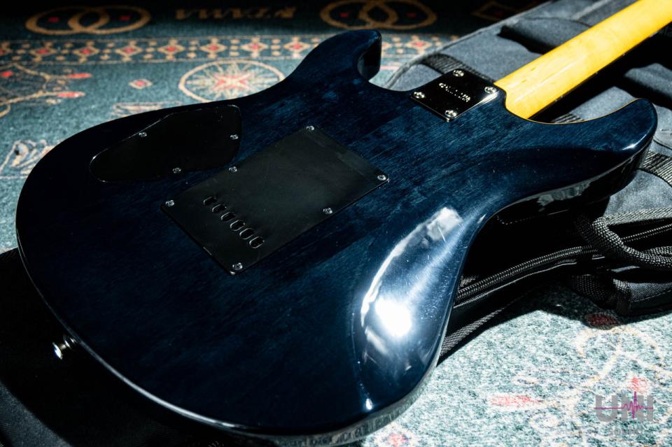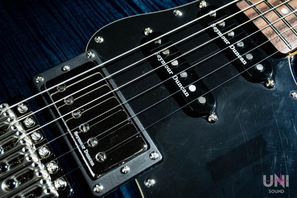 ピックアップはフロントにSeymour Duncan社製の「SSL-1」を、センターには同社製の「SSL-1 RwRp」、リアには同社製のカバードハムバッキング「Custom5」を搭載。3ピックアップ搭載で様々な音楽ジャンルに対応可能。 ボディトップ及びヘッドに美しい杢目のフレイムメイプルを配し、こちらは新フィニッシュ「インディゴブルー」シースルーカラー。ブリッジにはWilkinson社製VS-50を搭載し、スムーズなアーミングを実現。