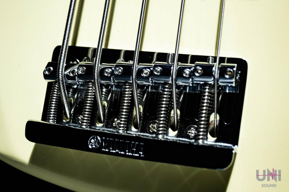 ボディ裏から垂直に弦を通す一般的な手法に比べ、このブリッジは45度の角度で弦を通すことで、弦振動のエネルギーをよりロス無くボディに伝えます。