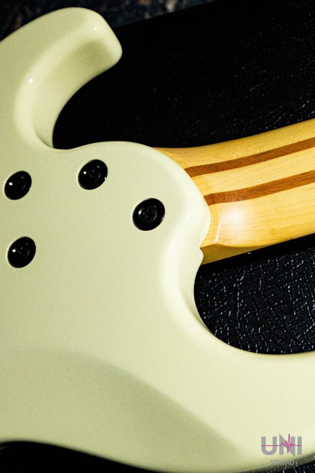 ネック接合にはボディ裏面から垂直にネックを固定する4本のネジに加え、ボディ裏から45度の角度でネックエンドを固定する2本のネジを追加したマイターボルティングネックジョイントを採用し、ボディと一体となった強力な鳴りを生み出します。