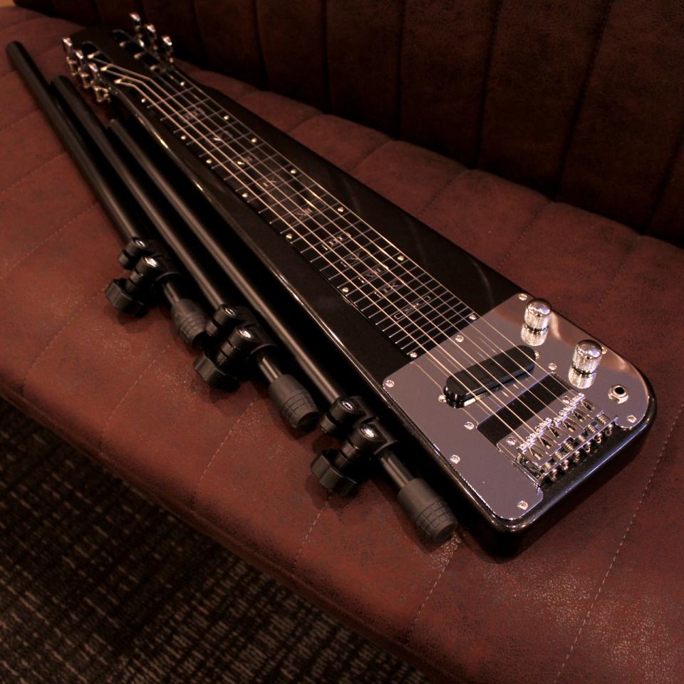 JAPANESE6弦仕様のスチールギター。膝の上に構えるスタイルはもちろん、付属の専用スタンドを使用することで立奏にも対応。